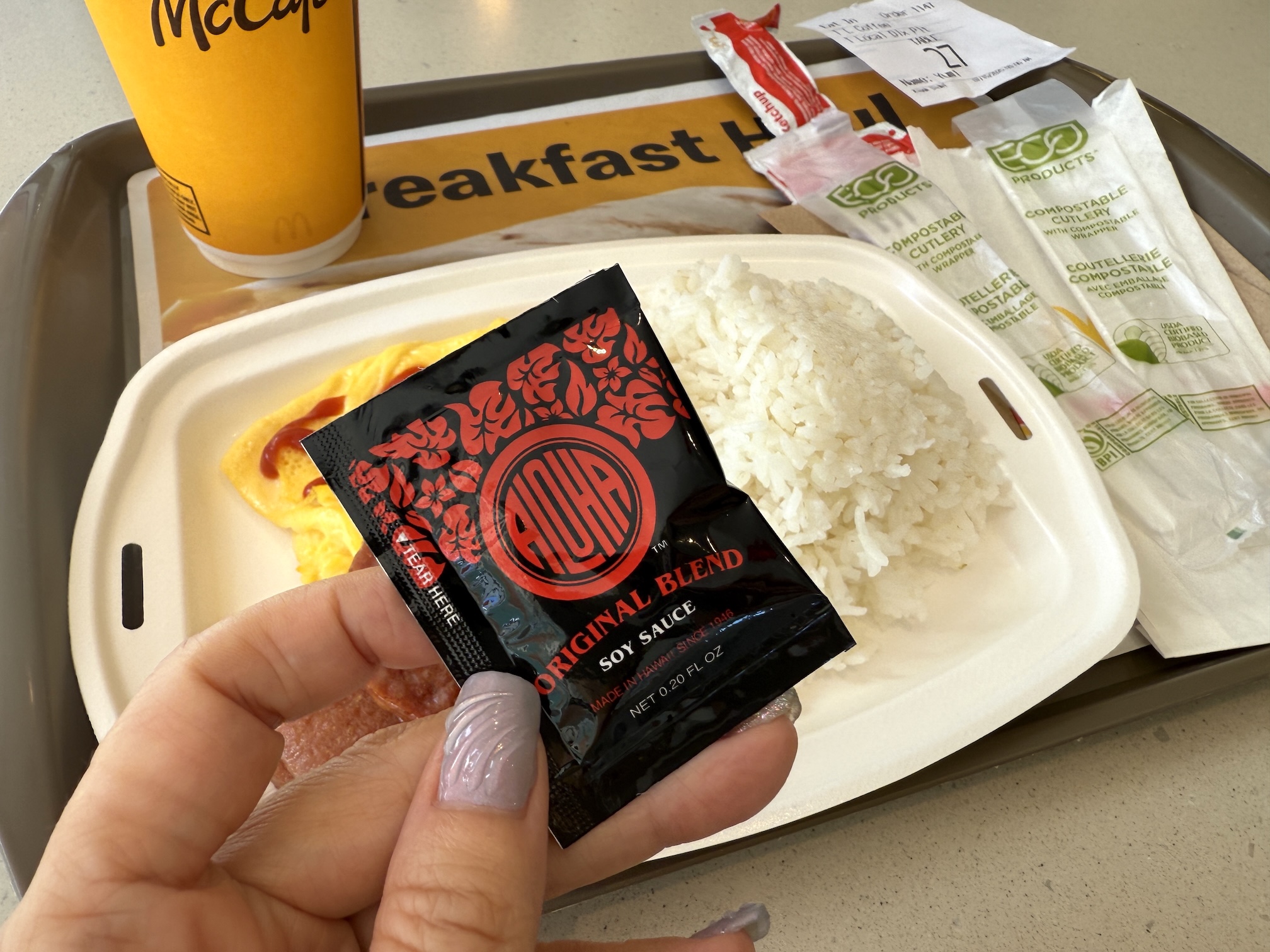 通のおすすめは「アロハ醤油」。注文時にお願いすると、小袋に入ったアロハ醤油を無料でもらえます。これはハワイ生まれのローカルブランドで、日本の醤油よりも塩分控えめ。白いごはんにそのままかけてもまろやかで、ごはんとの相性も抜群です。