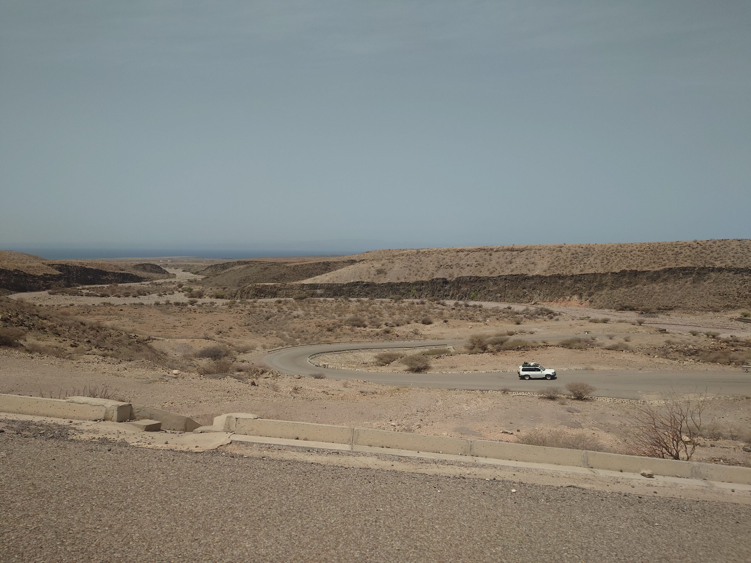 ジブチでは、一歩町を外れると無人の荒涼とした砂漠や岩地が広がっています。車の移動ではひたすら砂漠のなかの一本道を走ります。