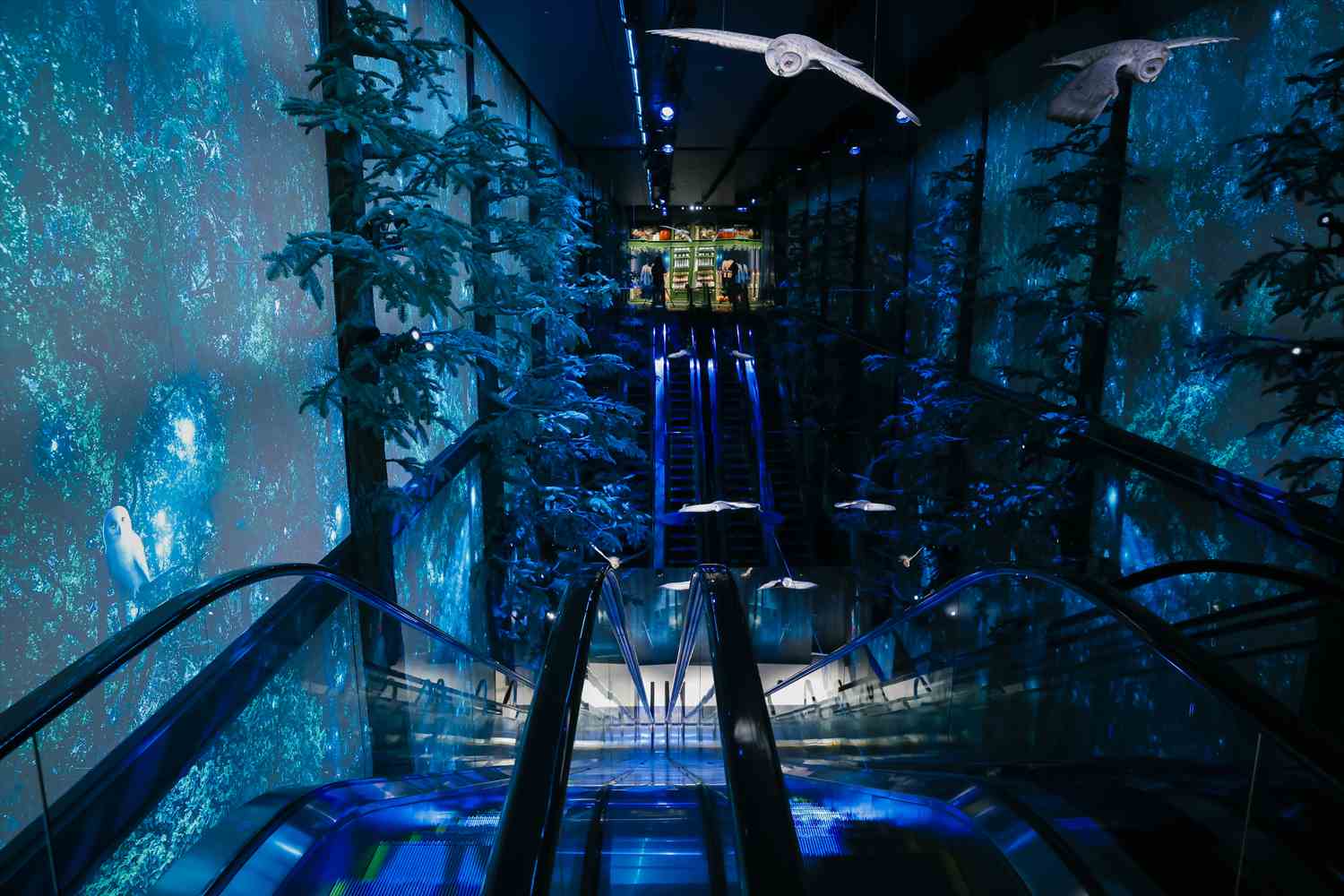 1階から2階へと続くエスカレーターでは、頭上にフクロウたちが舞い、壁にはケンタウルスの姿が描かれるなど、深い森の奥へ進んでいくかのような遊び心あふれる仕掛けが施されています。作品の世界観が散りばめられた内装にワクワク気分が高まること間違いなし!