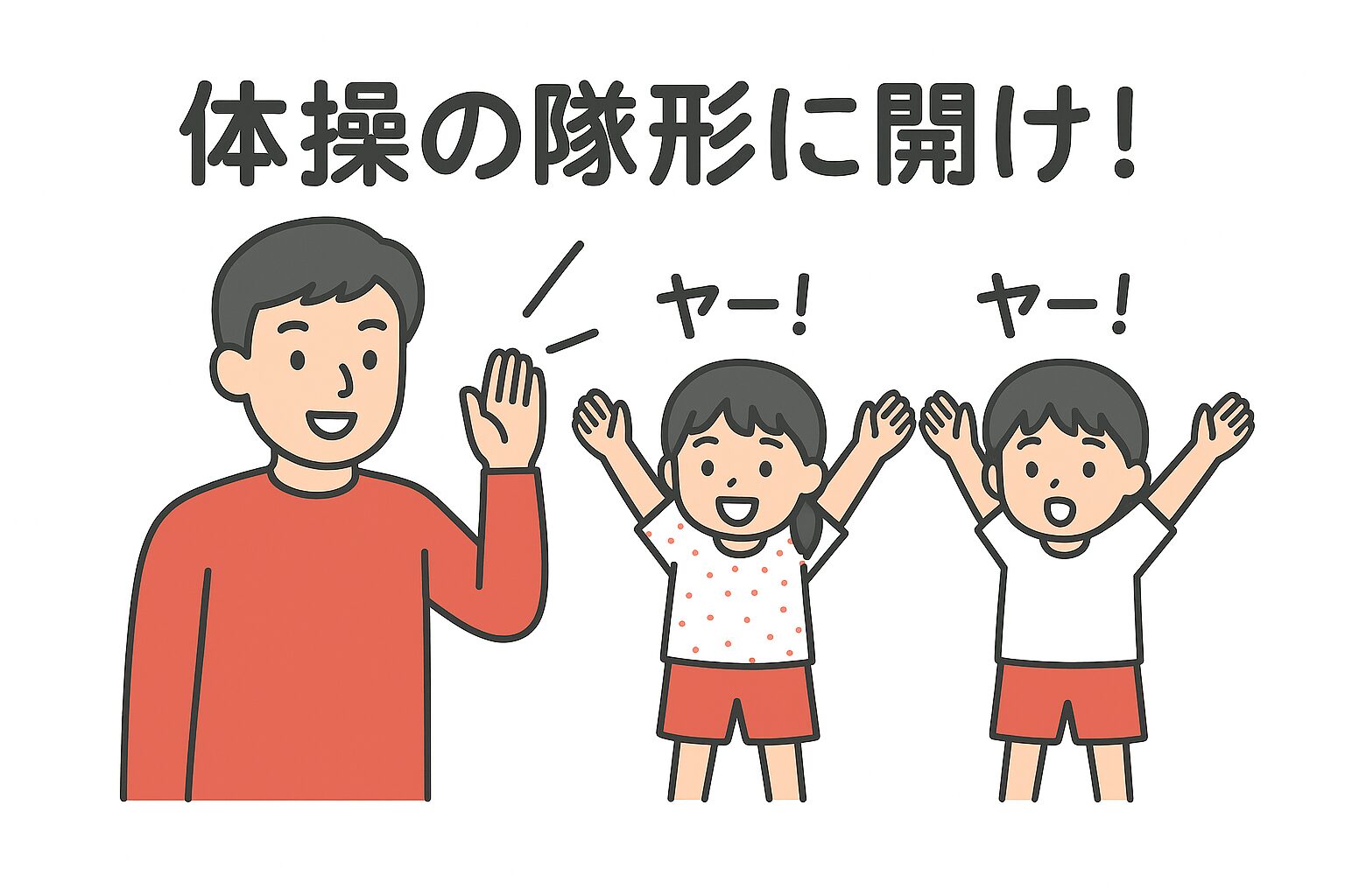 学校でのあるあるといえばこれは外せません。運動会の練習などで、体操のスペースを取るために広がるときのかけ声。「やー!」と発声したあと、生徒は腕を脇に寄せてかけ足で広がります。「やー!」の声が小さいと、先生にやり直しをさせられる流れまでがセット!?