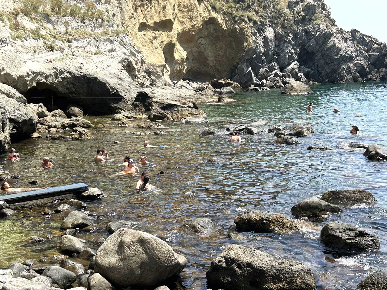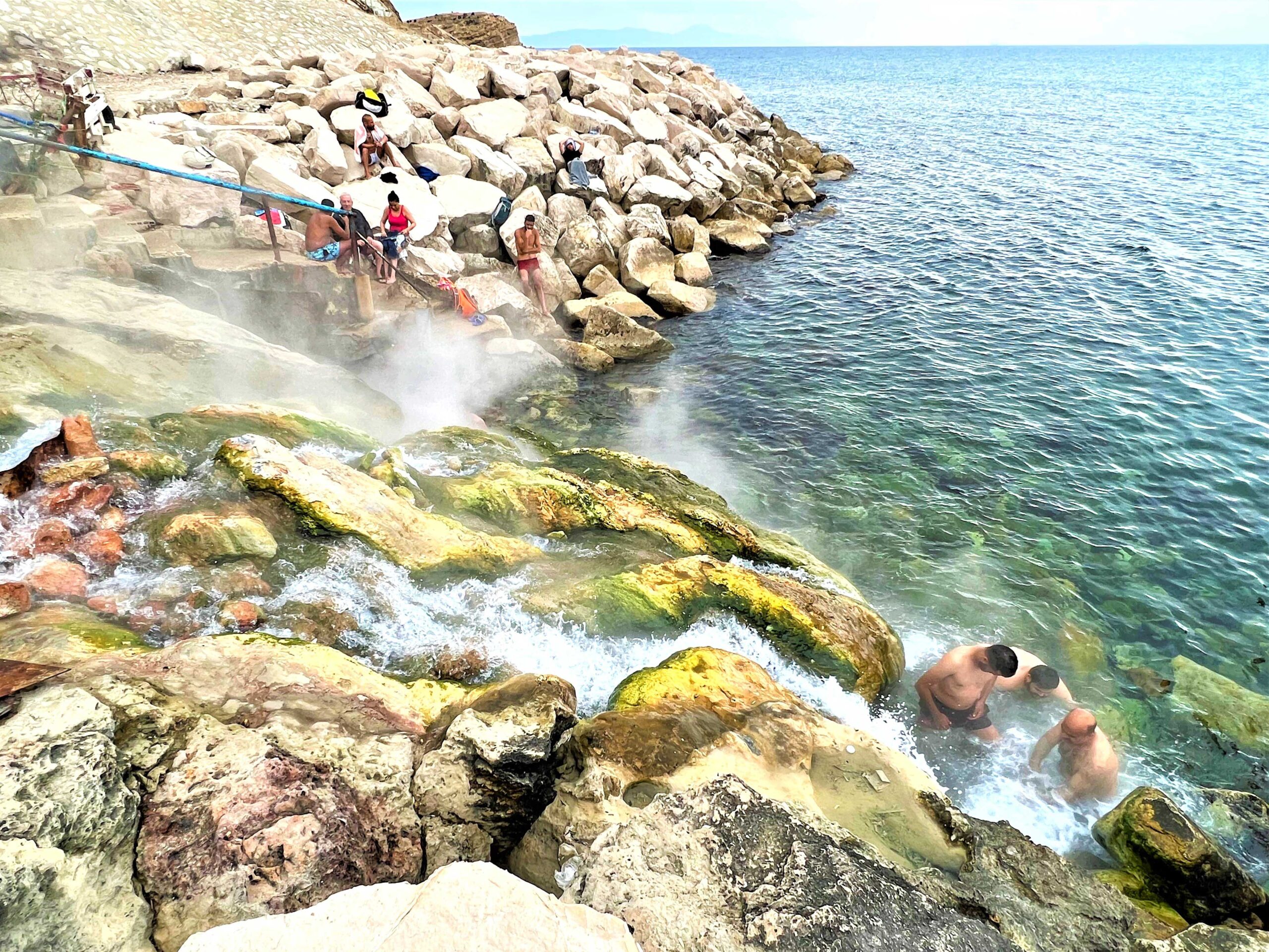 ナポリから高速船で西へ50分のイスキア島にはビーチリゾートや温泉施設が点在し、観光客でにぎわっています。ソルジェート温泉は、断崖絶壁の崖下の入江のような場所にあるため、234段もの階段を歩いて下るか、乗り合いボートを利用して海からアクセスする方法しかありません。なんとも冒険心をくすぐる立地です。波打ち際の数ヵ所から湧く温泉は高温のため、温泉卵も作れます。観光客の少ない冬には閉鎖される温泉施設が多いなか、1年を通して楽しめます。
