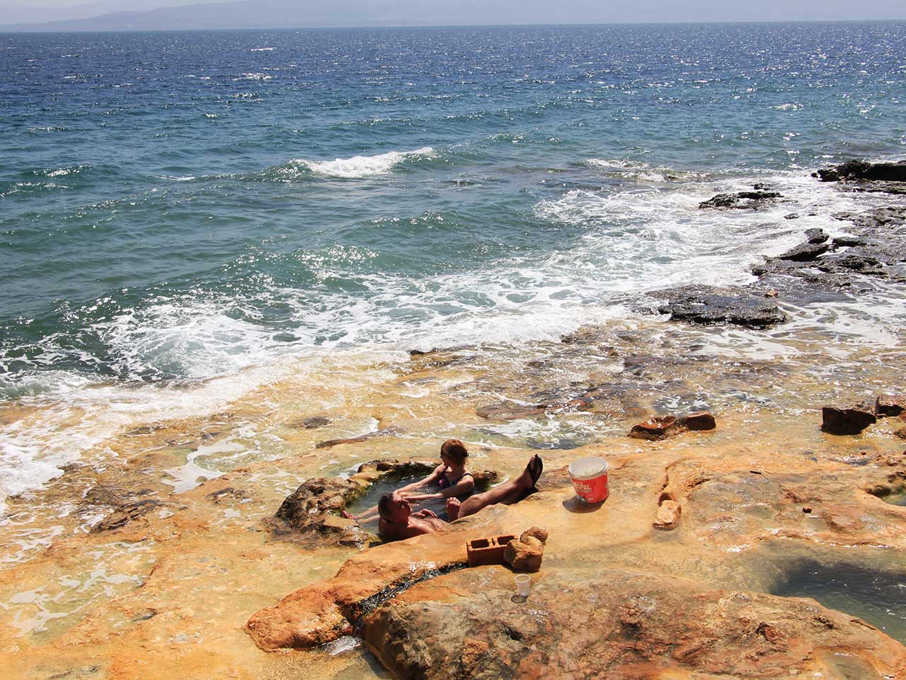 アテネの北に位置し、ギリシャで2番目に大きな島であるエヴィア島。本土とは橋でつながっていてアクセスが容易なことから、多くの観光客が訪れます。島の北端に位置するエディプソスは、ギリシャ神話の英雄ヘラクレスが傷ついた体を癒やしたと伝わる温泉。高級ホテルから共同浴場までさまざまな施設がありますが、海岸の野湯が人気です。析出物で彩られた岩盤をくり抜いた露天風呂に無料で入浴できます。