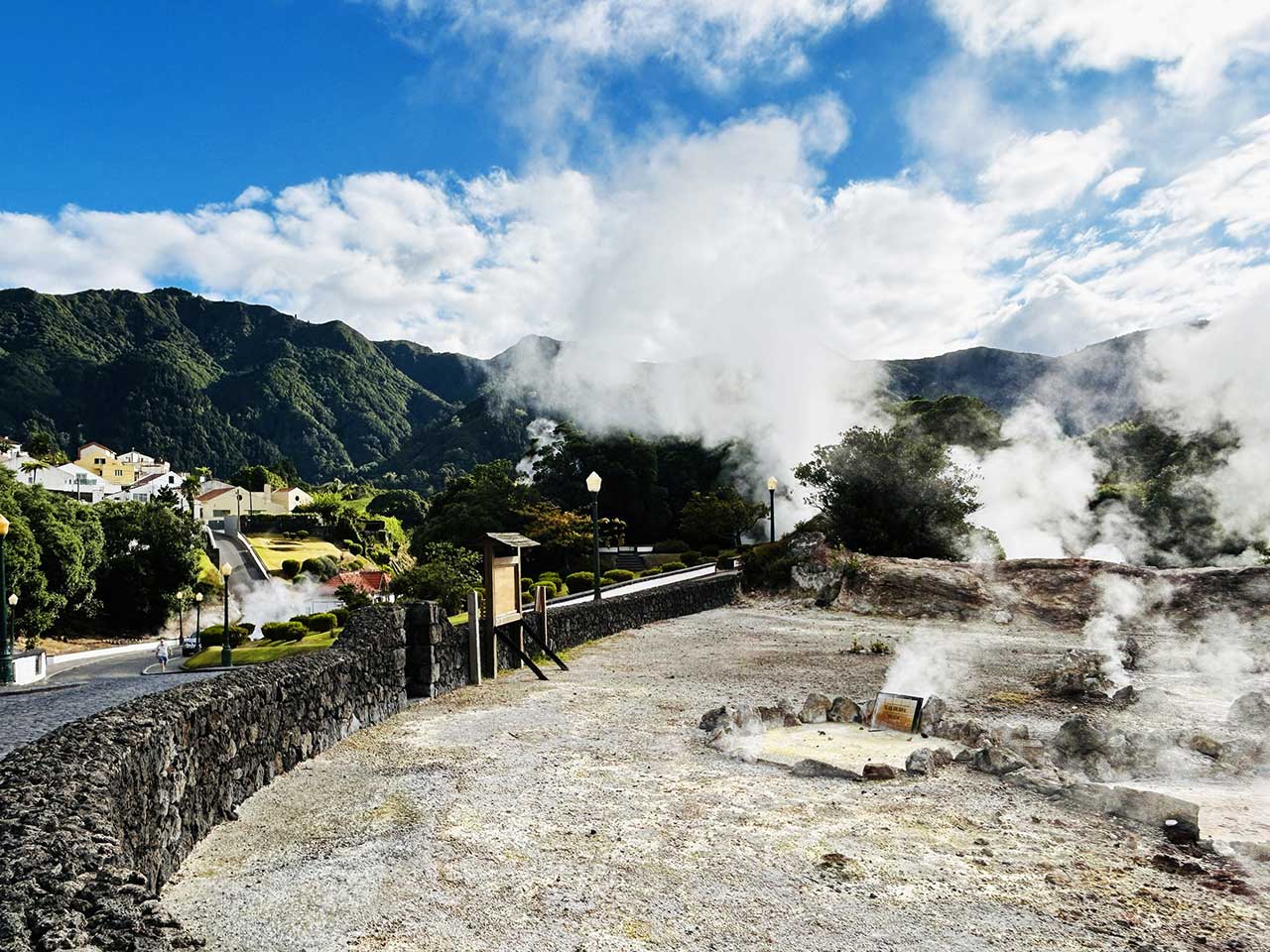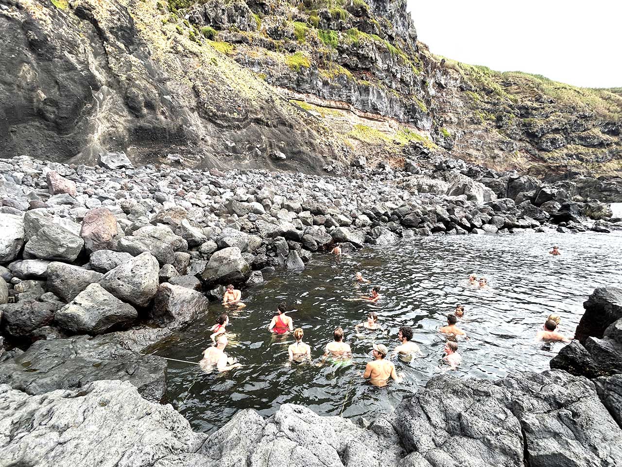 ヨーロッパ最西端に位置するポルトガルからさらに西へ1000km。9つの島からなるアゾレス諸島のひとつ、サンミゲル島は温泉の島として知られています。島の西部のフェラリア海岸は溶岩流が固まった岩礁地帯。温泉が湧いていて、満潮と干潮の中間の時間帯には、温泉と海水が混ざり合い適温です。細長い入江に湧いているので、寄せては返す波が強く、入浴中も張られた数本のロープにつかまらないと体が流されそうです。