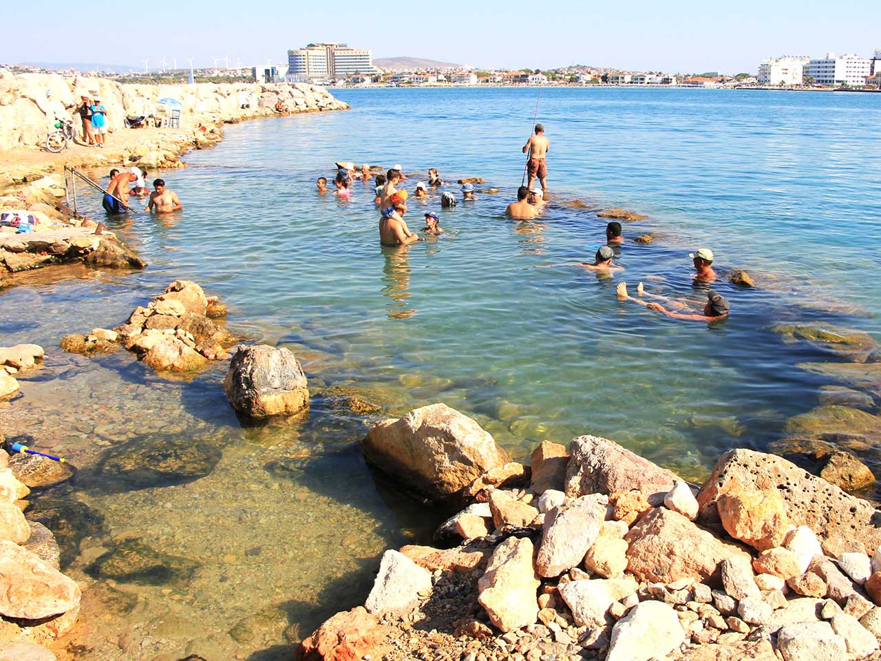 トルコ西部の海岸線の町イズミール。多くの旅行者が訪れるベルガマやエフェソスなどの世界遺産の玄関口となる町として有名です。西に突き出したチェシュメ半島には数多くの温泉が湧いていて、なかでもヨットハーバー近くのウルジャ温泉は、海と一体化した露天風呂。場所によっては高い温度ですが、噴出口から離れるに従い海水と混ざって湯温が下がります。地元の人はちょうど良い湯温のポイントを見つけて浸かっていました。