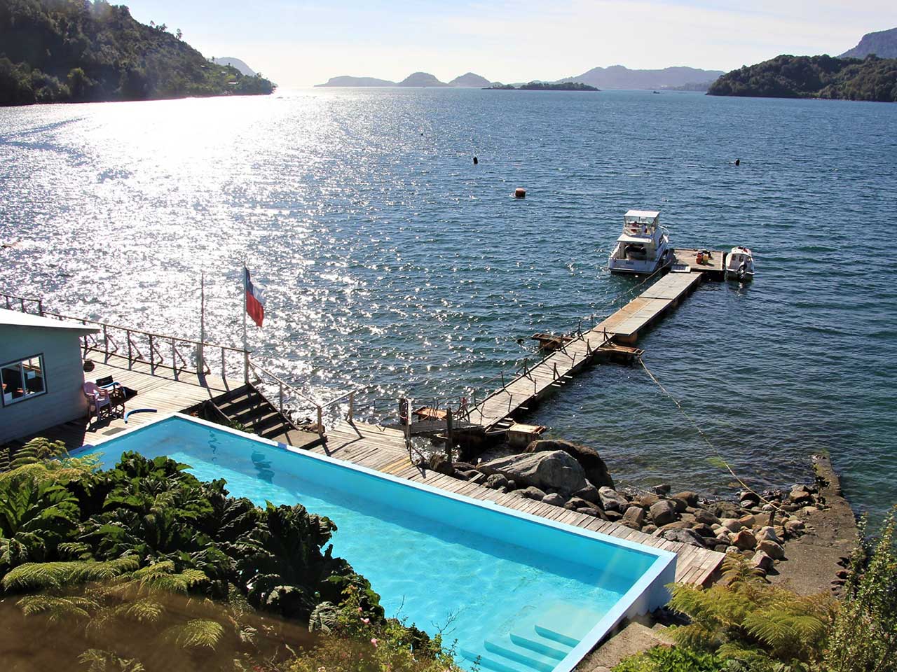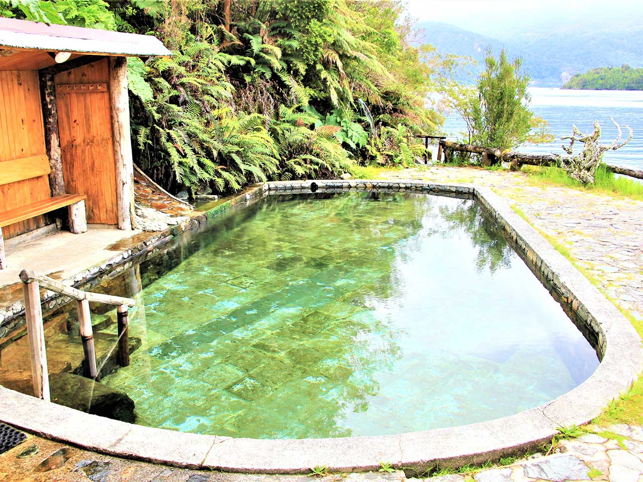 チリは南北4000kmキロにも及ぶ細長い国。複雑な海岸線が続く南部の湾内にジャンカウェ温泉があります。施設へのアクセスは船に限られていて、島の斜面に建つ2階建ての建物は部屋も廊下も木造で、木の質感が清々しく感じられます。水平線は湾曲して見えるので、地球の丸さを感じながら入浴できる温泉プールが宿の自慢です。見た目はただのプールのようですが、塩味と硫化水素臭のある本格的な温泉です。