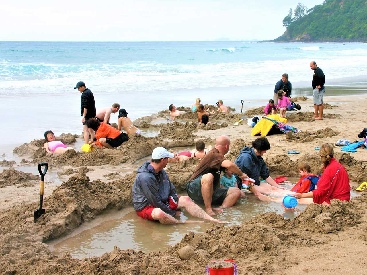 オークランドの東に位置するコロマンデル半島には、1日2回の干潮時だけ、ビーチに現れるユニークな温泉があります。スコップで砂浜を掘り、自分で露天風呂を作って入浴するホットウォータービーチです。深く掘るのは難しく、寝湯か半身浴が精いっぱいですが、夏場のアクティビティとして人気です。スコップは現地でレンタルできますが、週末は混雑するので、早めの到着が必須です。