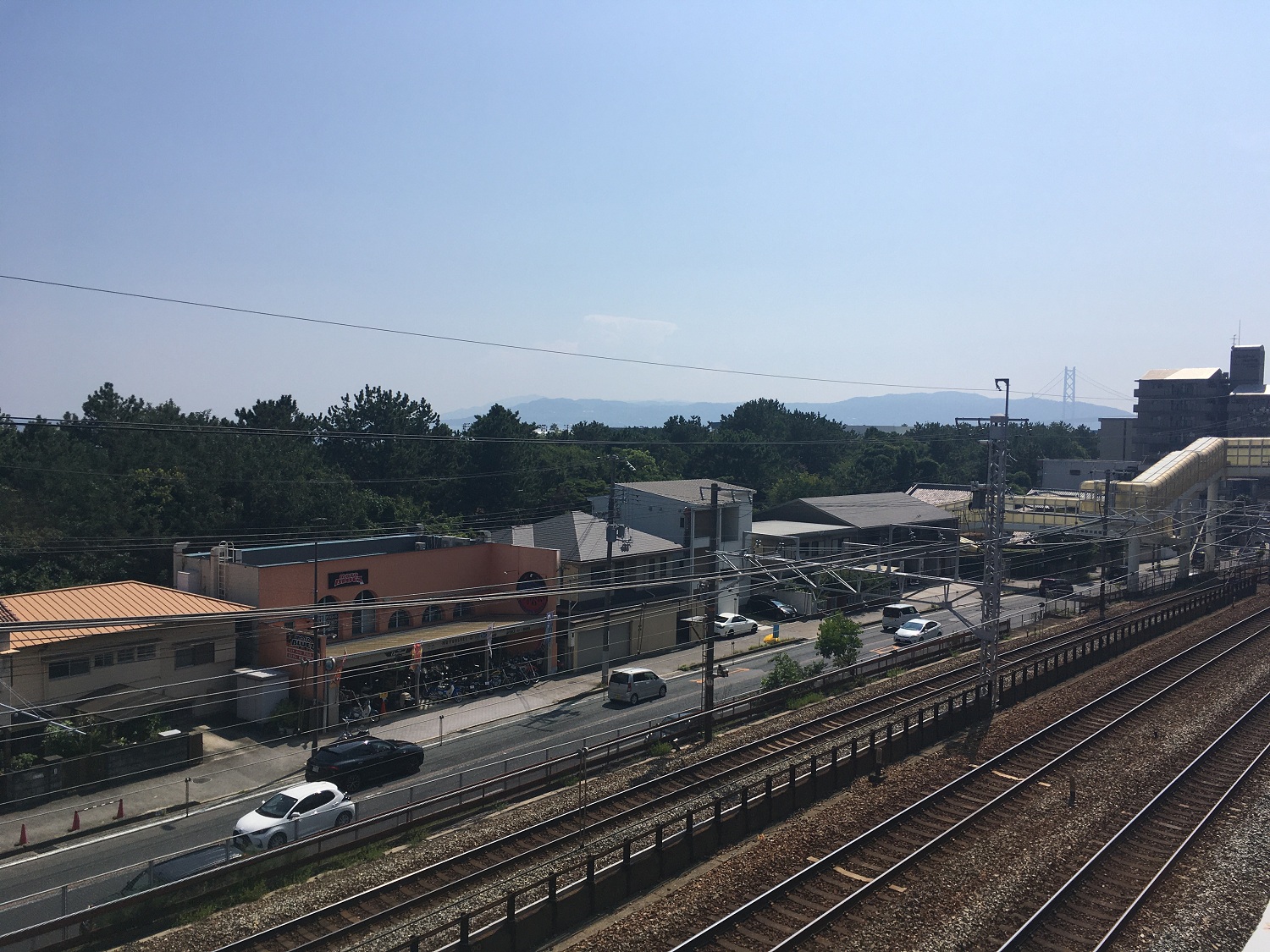 駅の周辺は北に傾斜地、南に海が迫るという地形のため、段々畑のように南側から国道2号線、JR、山陽電鉄が東西に走っています。潮の香りを感じるほど海から近い場所にも関わらず、高台にある東垂水駅は視界が開けていて、見晴らしがとてもよく、ホームからは並走するJRの線路やひっきりなしに車が行き交う国道2号線を、ホームからさらに標高が上がる北口からは瀬戸内海を眺めることができます。