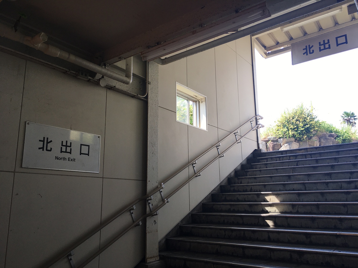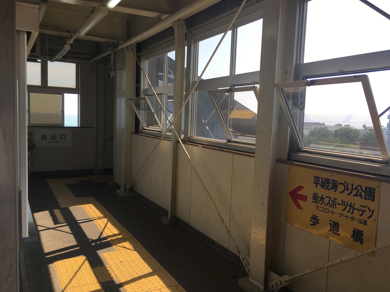 改札から左側に出て少し長い階段を下ると南口です。南口から海側には歩道橋が伸びていて、JRの線路や国道2号線の上を通り平磯緑地にアクセスすることができます。