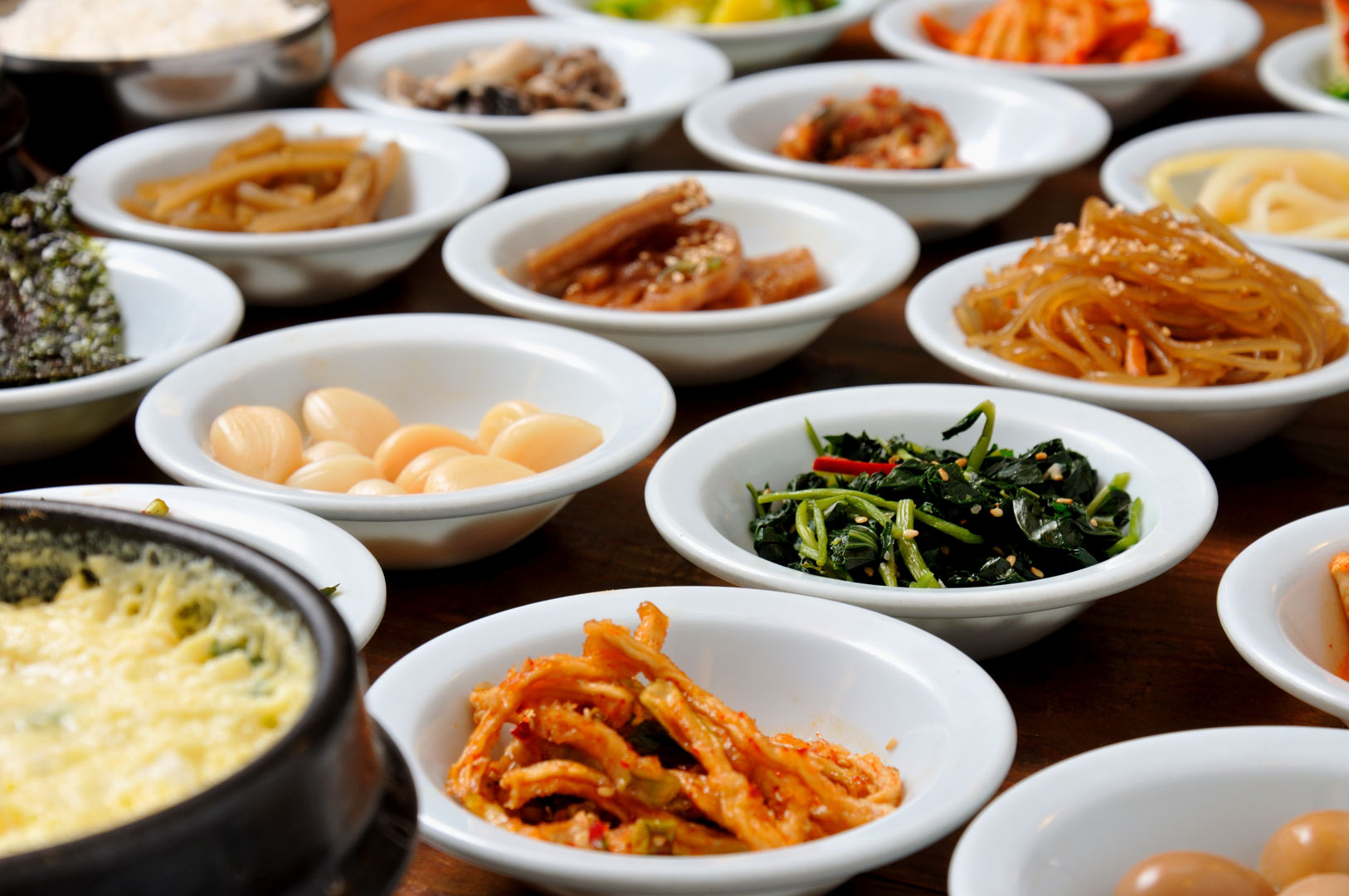 韓国料理のレストランでは、メイン料理のほかにキムチをはじめとするパンチャン(おかず)の小皿が複数提供されるのが一般的です。基本的にはおかわりOKなので、追加が欲しいときは遠慮せずに「이거 더 주세요(イゴ ト チュセヨ)=これのおかわりをください」と言ってみて。