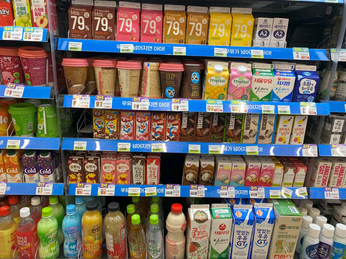 ドバイチョコや漢江ラーメン、グリークヨーグルトにリバイバルブーム中のバナナウユ+パウチドリンクのアレンジなど、SNSをにぎわせている韓国のコンビニグルメ。CU、GS25、emart24、セブン-イレブンの4社が人気で、日本同様24時間営業。お弁当やスナック、ドリンクなどが揃っています。4社ともPB商品やコラボ商品に力を入れていて、SNSで情報をアップしているのでチェックしてみてください。また、コンビニで見逃せないのが「1+1」や「2+1」。1個(2個)買うともう1個無料のイベントで、まとめ買いで得するチャンスです。