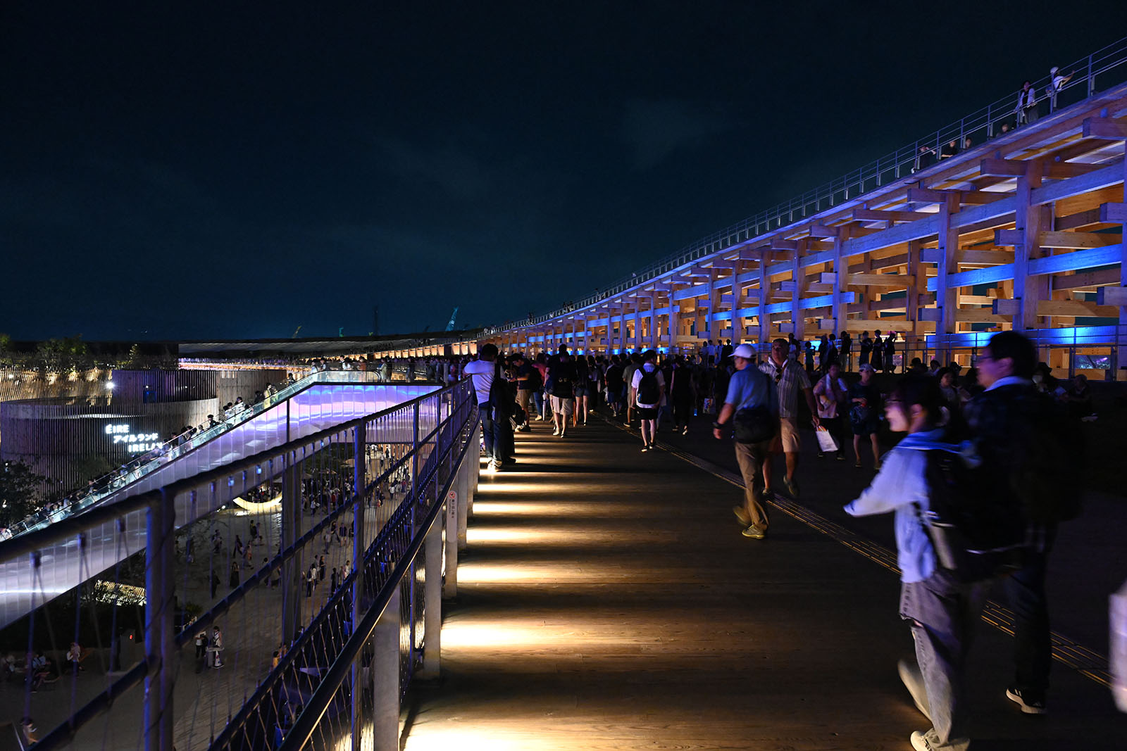 16:00から入場できる夜間券を利用。リングに上ったり、行列の少ない単独パビリオンに入ったりして、会場の雰囲気をつかむ。夜のショー鑑賞にもトライ。ドローンショーも見ておく