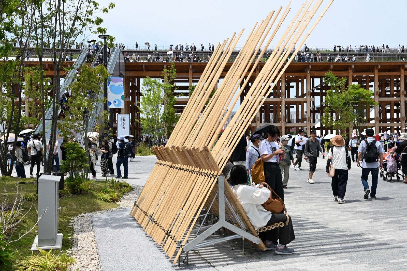 入場したばかりの家族連れと、大屋根リング下のベンチで隣合わせになったときのことです。その家族のお父さんが当日予約を入れようと「近くのパビリオンにでも入るか」と言いながら検索していました。しかしそこで初めて、どこも空きはなく予約は簡単には入らないということに気づいたようで、ショックを受けていました。