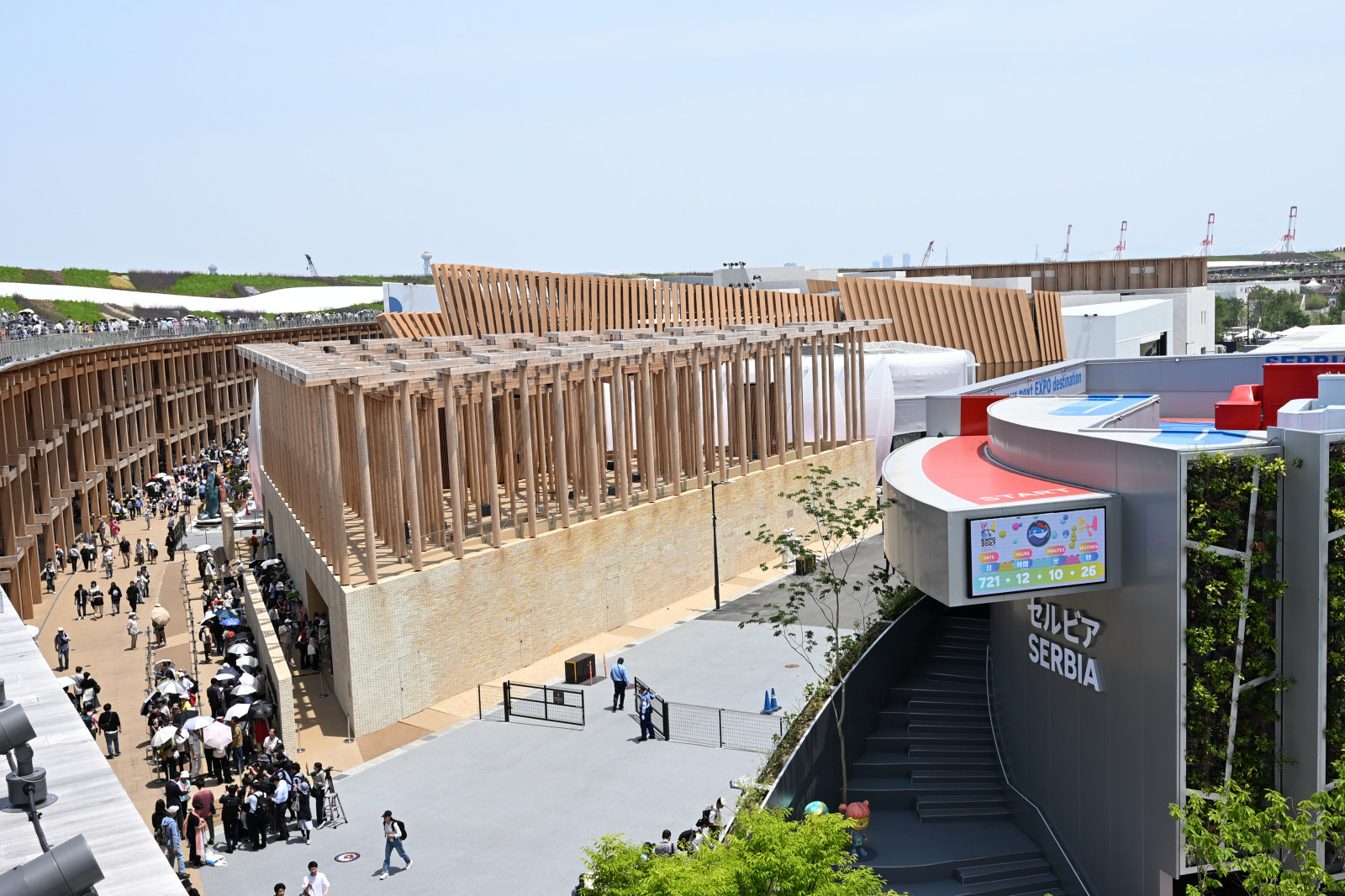 入場したら真っ先に大屋根リングに上って、会場全体を見渡したいと思われる人も多いでしょう。パビリオン見学はまったく興味ないという方ならそれでもいいですが、入館したいパビリオンがあるなら、やはりそちらに直行しましょう。人気パビリオンは朝から行列していますが、それでも朝早めの時間帯はまだましな状況です(アメリカ館やイタリア館は開場直後に2時間以上の待ち時間ができます)。行ったときにたまたま行列が短くなっているという可能性もありますので、まずは入館したいパビリオンに向かいましょう。