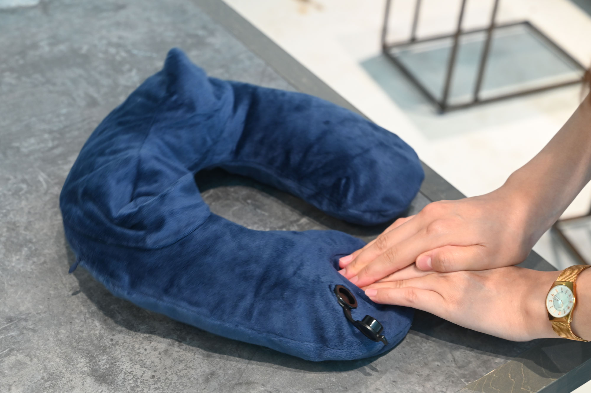 口をつけることなく、ポンプで簡単に膨らませることができ、空気を抜くのもボタンひとつで簡単です。肌ざわりがよく、カバーも取り外して洗えるところも気に入っています。この商品はアイマスクと耳栓付きですが、付いていないものはもう少し安価で売っているようです。荷物としては握りこぶしふたつ分は増えるので、7時間を超える長距離フライトの際のみに持参します。ヘッドレストがしっかりしている座席の際はネックピローとぶつかるので、腰にあててに使用することもあります。(編集室・福井)