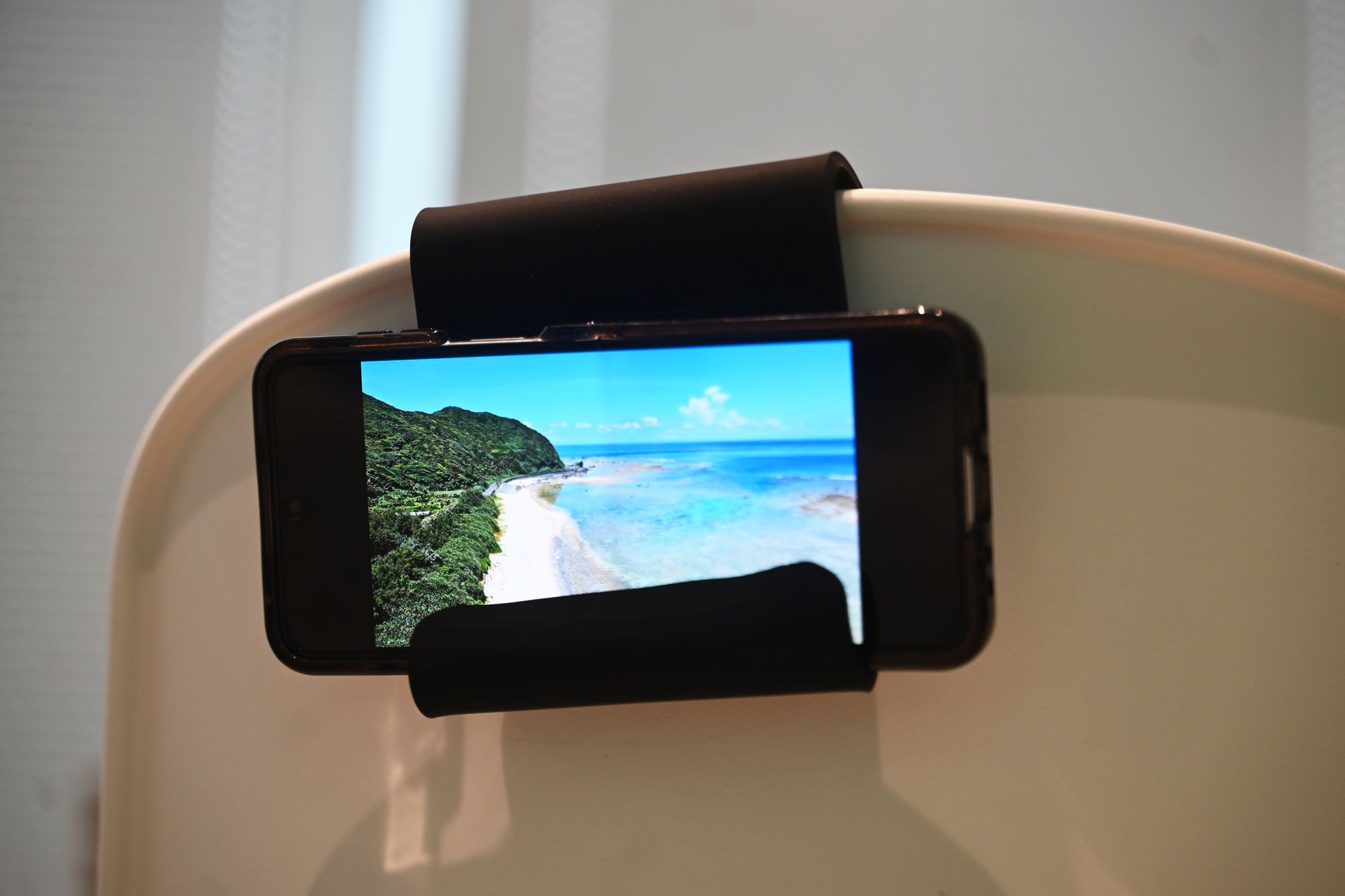 閉じた状態の機内テーブルに引っかけて使えるスマホスタンド。スマホが落ちづらいようにスタンドを曲げるコツがいりますが、ベストな角度と曲げ方を見つけると安定。もう少しだけ軽いとうれしいのですが、持ち運び時は下敷きのようにどんな隙間にも入るのでかさばらないのがポイント。(編集室・福井)