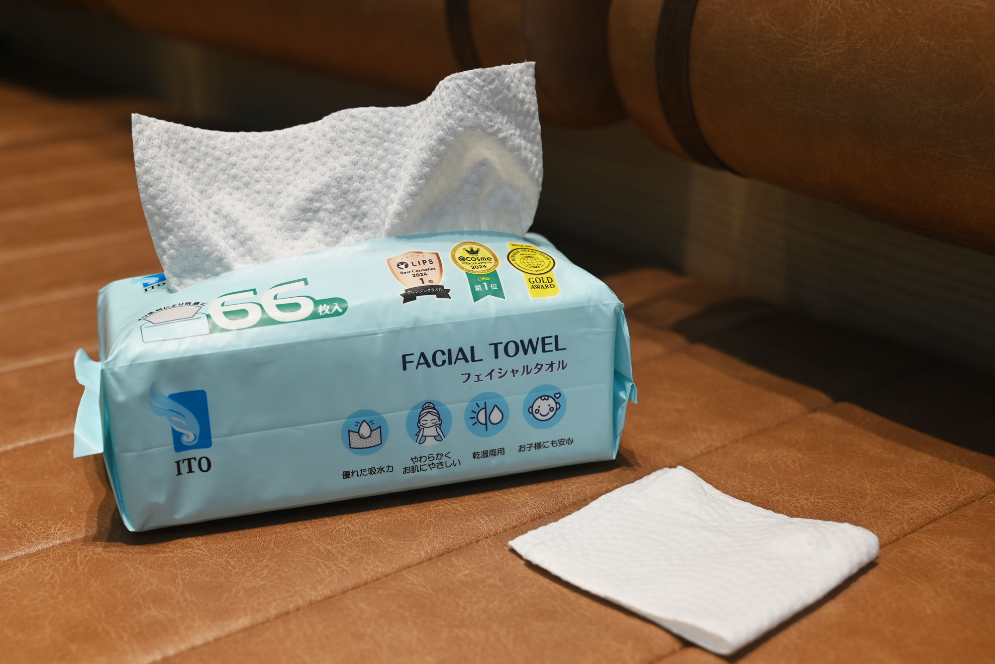 普段の洗顔もITOフェイシャルタオルを愛用しています。タオルは洗濯をしても手を拭いたりすると雑菌が繁殖したり、ティッシュで拭くと薄すぎてしまったりしますが、このフェイシャルタオルは地厚で表面がボコボコしている面とタオル生地の面に分かれており万能。海外ではよりタオルで顔を拭くことに抵抗があるので、このフェイシャルタオルが欠かせません。他にはホテルのコップやお皿を洗った際のキッチンペーパー代わりにもなるので、衛生面の対策にもなり使い勝手抜群です。(編集室・地原)