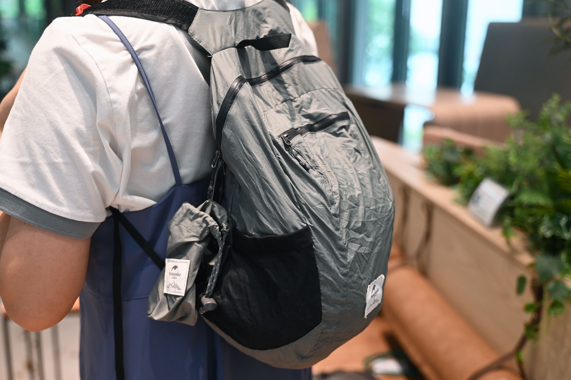 本体重量約110gの驚きの軽さ、収納袋と一体になっており無くさないので安心。使わないときは極めてコンパクトに収納できるので、旅の荷物に忍ばせておくと何かと便利。フタが大きく開くので、荷物の出し入れも楽にできます。(社長・新井)