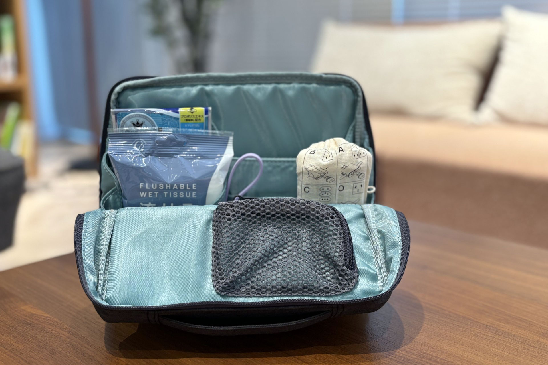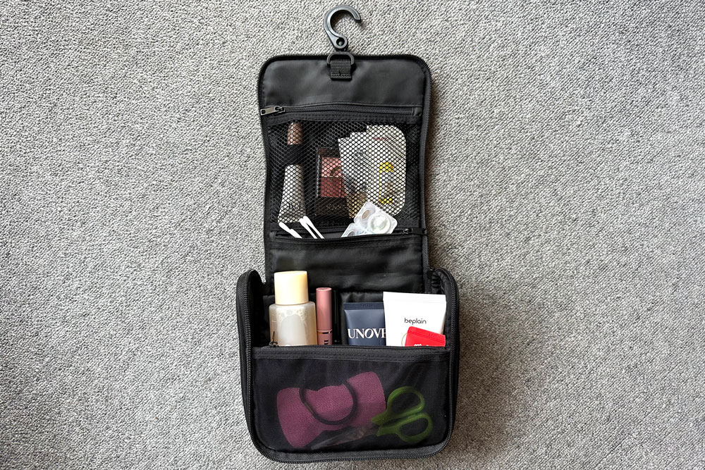 旅行好きには定番の無印良品のトラベルアイテムですが、私も何年も愛用しています。ジッパーで閉じると見た目はコンパクトなのに、マチがしっかりあるので化粧品のボトルもそのまま収納可能。大小さまざまな仕切りやポケット付きで、コンタクトレンズや綿棒など細かいものも整理しやすく、迷子になりません。フック付きで吊るして使えるうえ、海外のホテルで掛ける場所がないときでも、ちゃんと自立してくれるのも優秀。(編集室・斉藤)