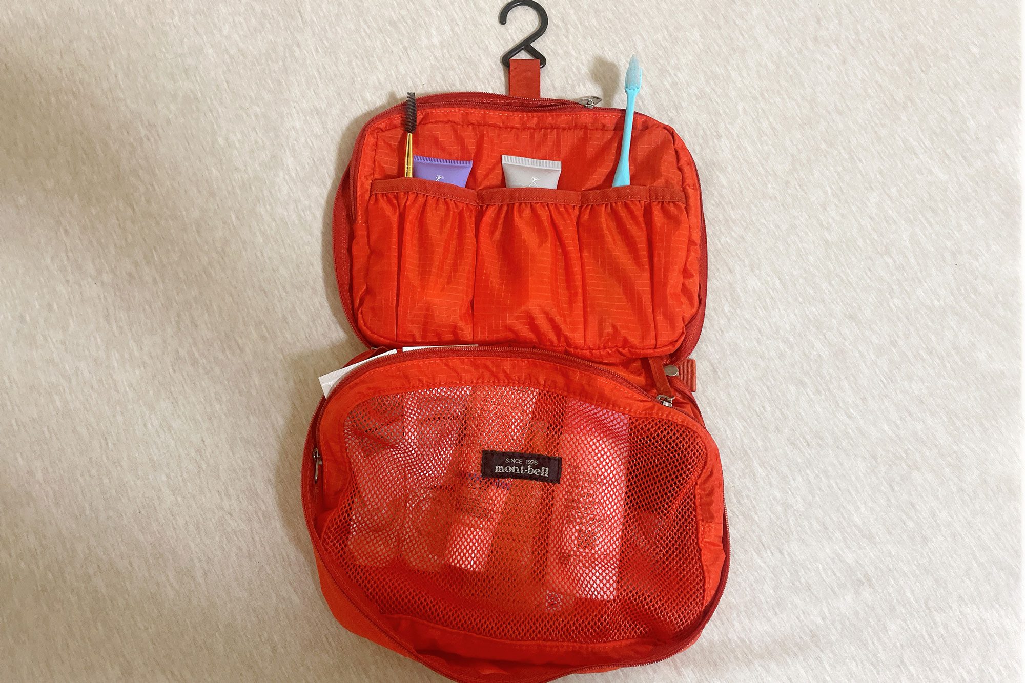 80gという軽さと使いやすさが魅力のトラベルポーチ。歯ブラシや洗面用具、軟膏、メイク道具がきれいに収まり、ジッパーでサッと閉じればそのまま持ち運びOK。スーツケースの隙間にもすっと入ります。フック付きで洗面台や壁に吊るすことができるので、狭いスペースでも使い勝手がよく、生地が丈夫で濡れても安心。使用後は丸洗いしています。スーツケースの中からも見つけやすく、元気が出るような暖色がお気に入り。アウトレットで購入。(編集室・今井)