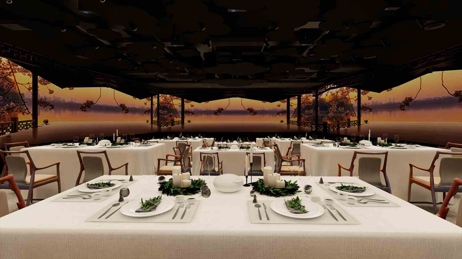 Taste of Chinaでは、迫力ある映像演出とライブパフォーマンスが各料理を鮮やかに彩ります。漢服をまとったダンサーが蘇州の庭園を舞い、デジタル映像のリズムと調和します。別の章では、演者が棒を操る少林武術の演舞が繰り広げられます。さらに、桂林の漁期を描く場面では、来場者がテーブル上のインタラクティブゲームで魚を捕まえる体験も楽しめます。