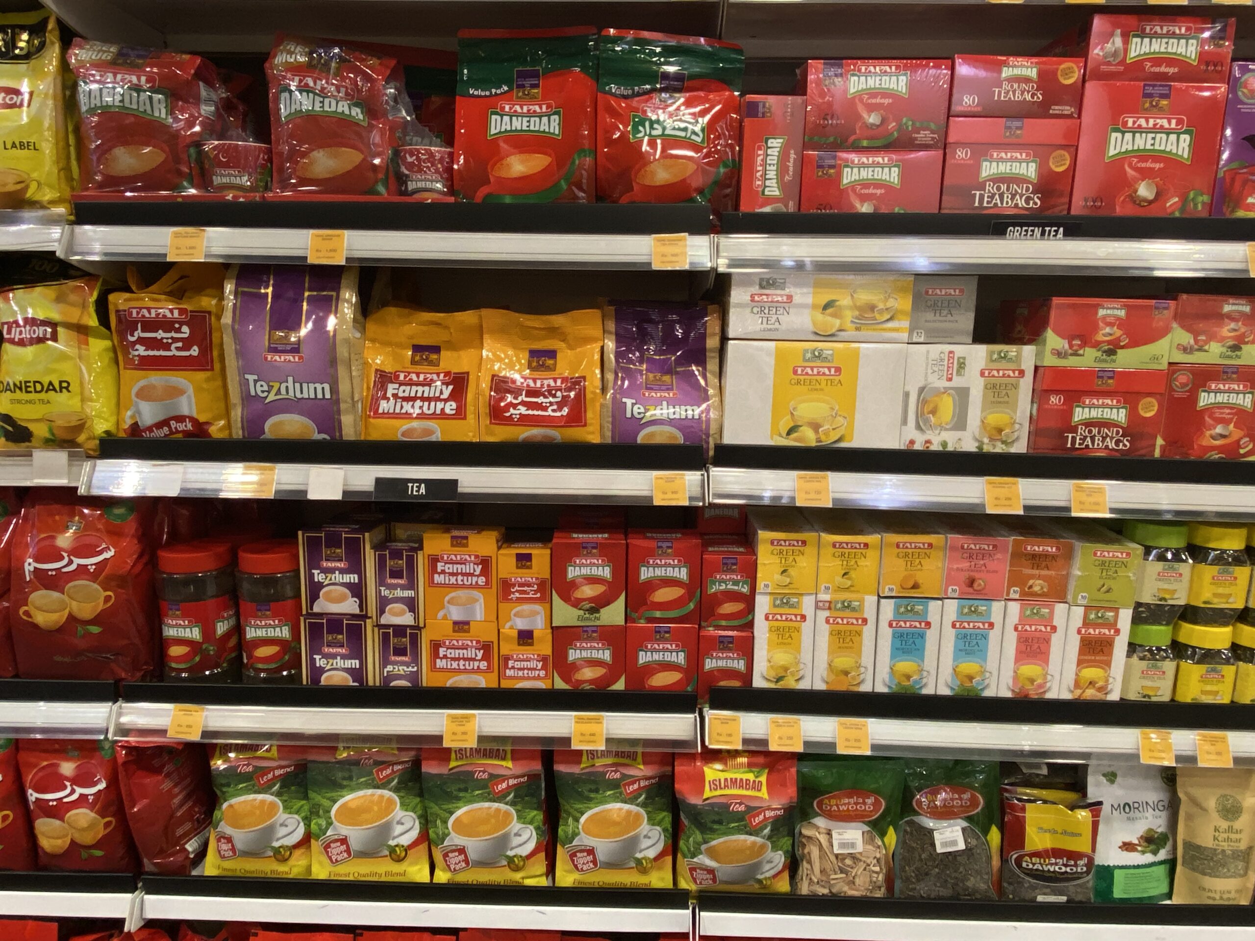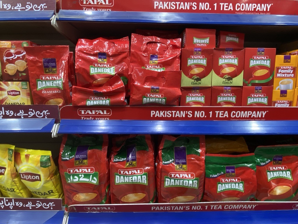 レストランやカフェはもちろん、パキスタンでは家でもチャイを飲む機会が多く、一般的なスーパーでも茶葉の種類やサイズは驚くほど豊富です。手のひらに収まるお土産用の小さなサイズから、家庭用の特大サイズまで、さまざまなバリエーションが揃い、チャイがいかに日常に根付いているのかが伝わってきます。