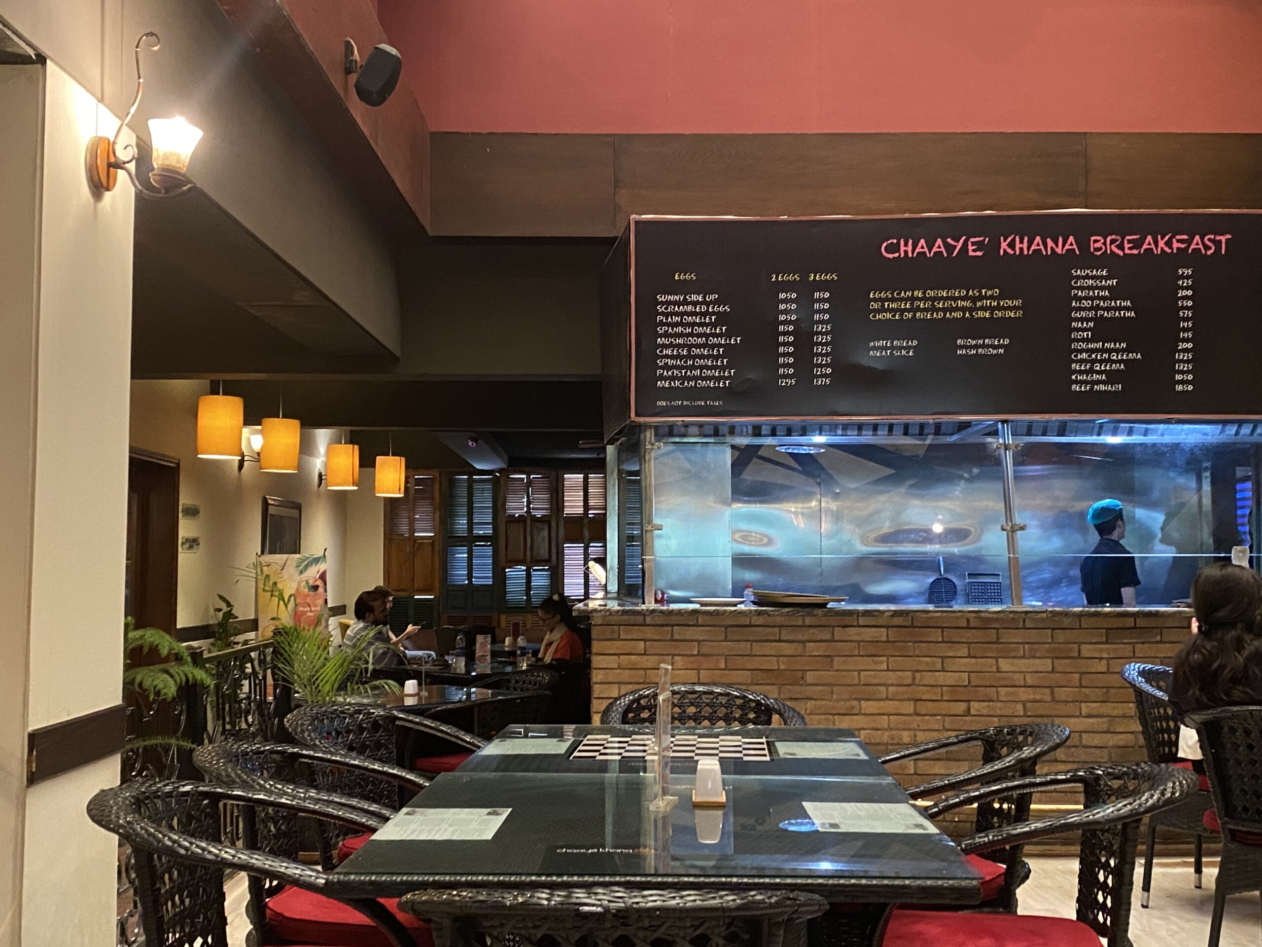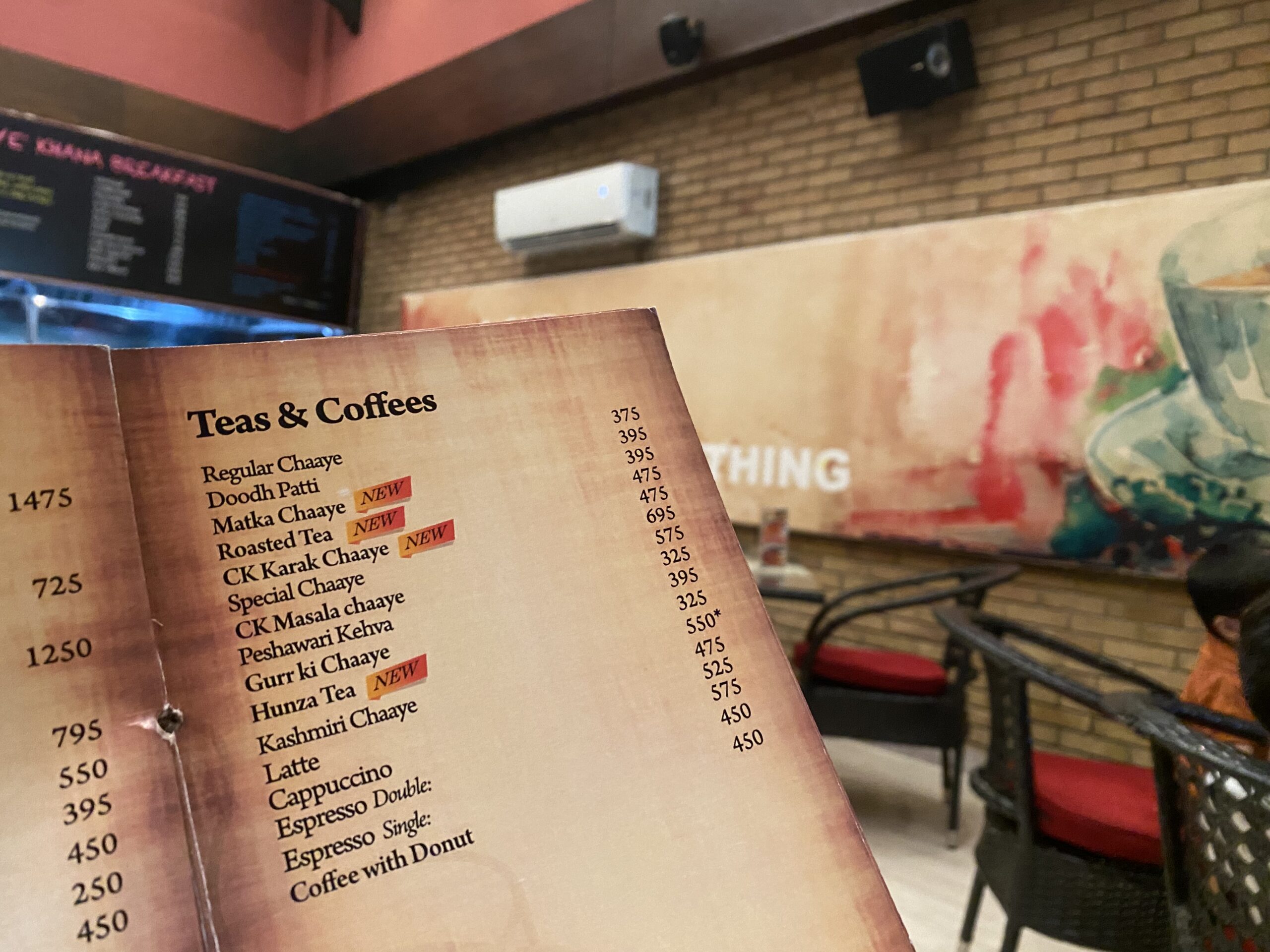2店舗目は「Chaaye Khana」です。パキスタン各地に展開している人気のカフェで、町のあちこちで見かけることができます。店内に入ると、落ち着いた照明と木目調のインテリアが心地よく、ゆったりとした時間が流れています。メニューには、チャイはもちろん、朝食やケーキなどの軽食も充実していて、ちょっとした休憩にもぴったり。気軽に利用でき、パキスタンの人々の生活の一端を感じられるスポットです。