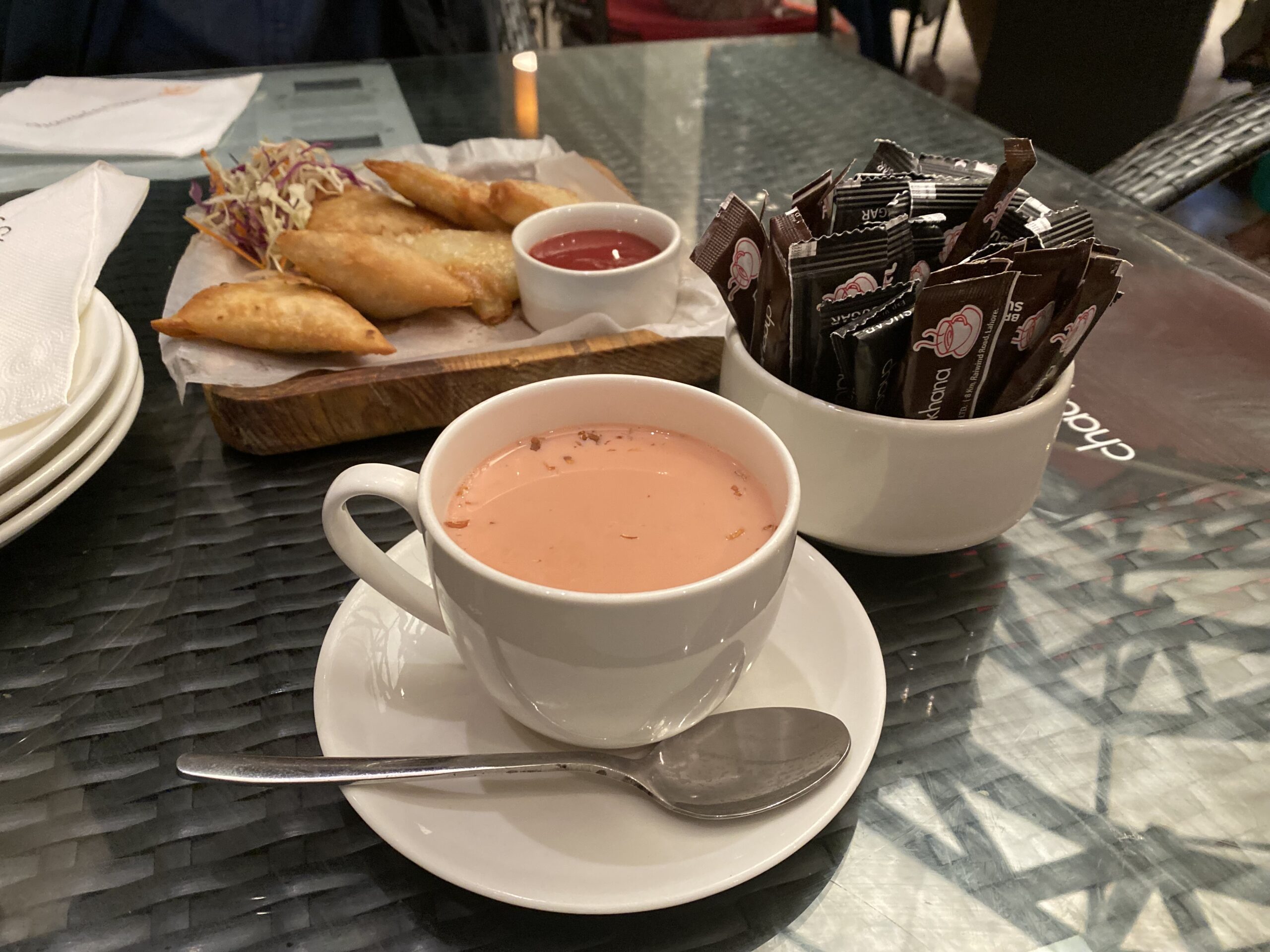 鮮やかなピンク色は、緑茶に重曹を加えることで生まれます。見た目のインパクトは強いですが、口に含むと意外にもまろやかで優しい味わい。奥に写っているのは、軽食の定番のサモサ。チャイとの相性抜群です。