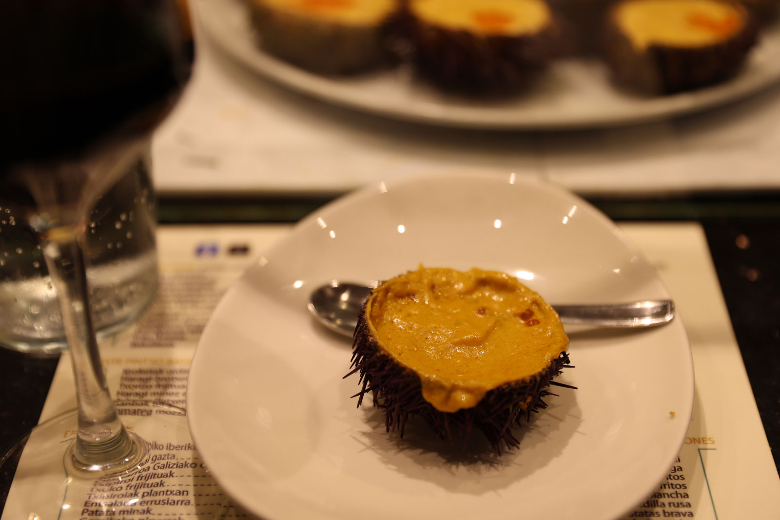 そう、ここでの名物はウニのクリーム「クレマ・デ・エリソ」。絶えずオーダーが入り、カウンターのショーケースに並んでは消え、並んでは消えを繰り返す超人気メニューです。注文を入れると一度厨房に運び込まれ、お皿の上で温めた状態で提供される一品。口に入れた瞬間、しっかりとウニの味覚が感じられるのはもちろんですが、上に乗った魚卵の塩加減もちょうどよく、クリーミー&プチプチした食感が同時に楽しめます。