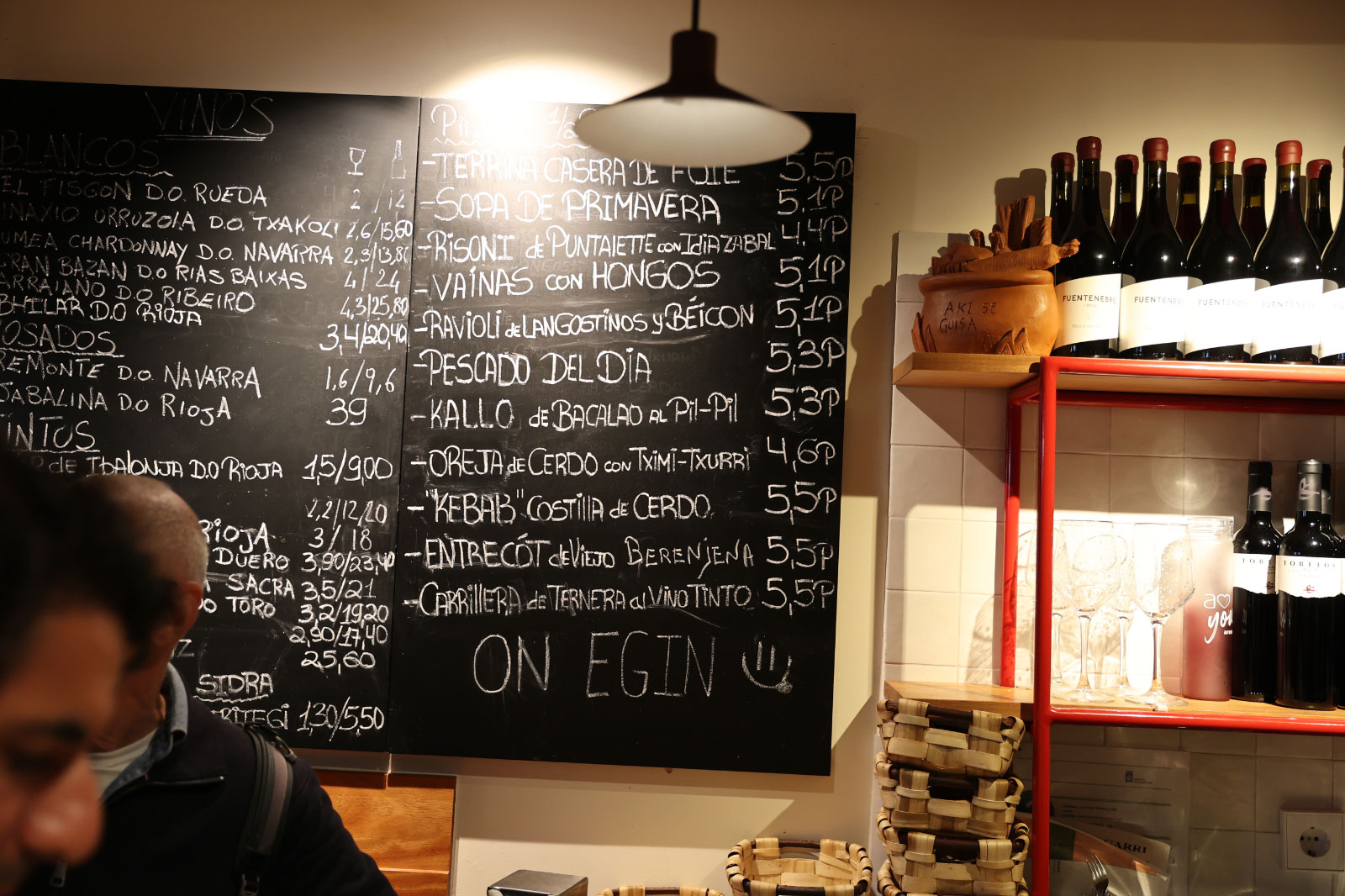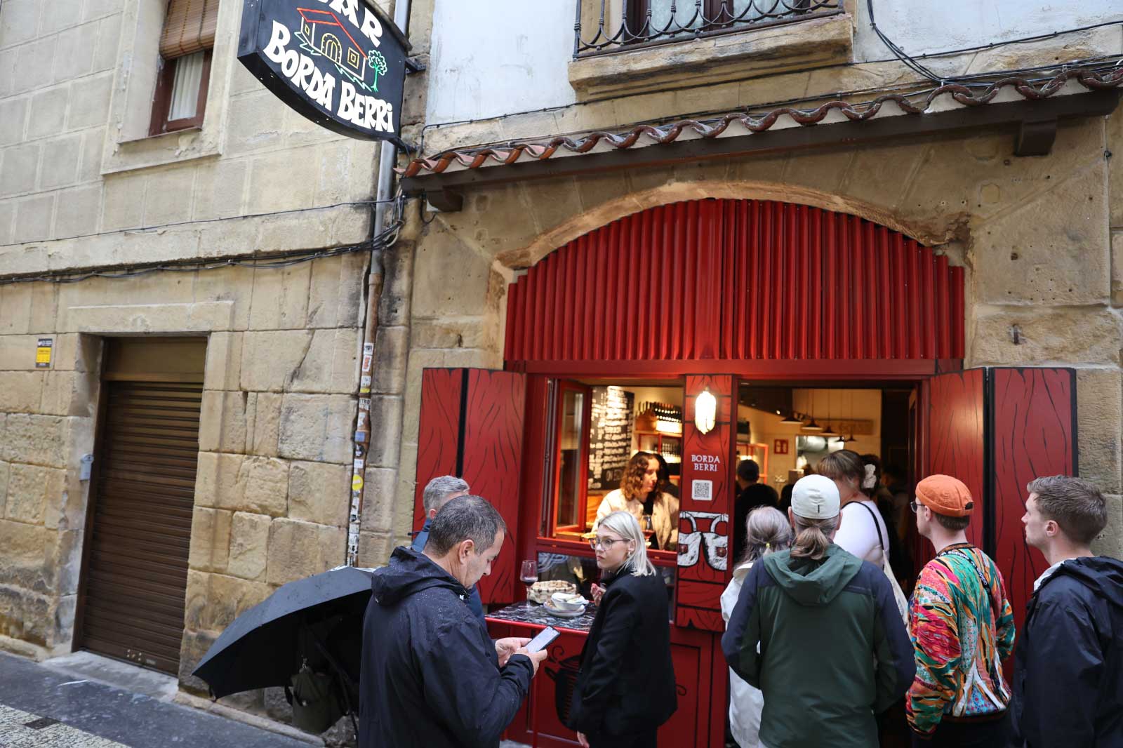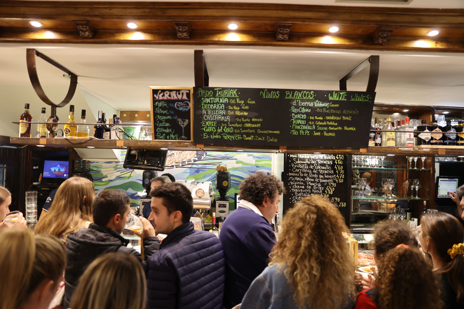 続いては、いよいよ旧市街へ。多くのバルが立ち並ぶフェルミン・カルベトン通りで、ひときわ行列の目立つボルダ・ベリを目指しましょう。バスク地方のバルは、基本的にはガラスケースの中に小皿料理が並び、それを指差しでオーダー(メインは看板やメニューからオーダー)するのが基本ですが、こちらのお店はすべて看板からオーダーするスタイル。看板には常時10〜15種類のフードメニューがスペイン語で並ぶため、初めての人はちょっと緊張するかもしれませんが、名物メニューを事前に把握しておけば大丈夫です。