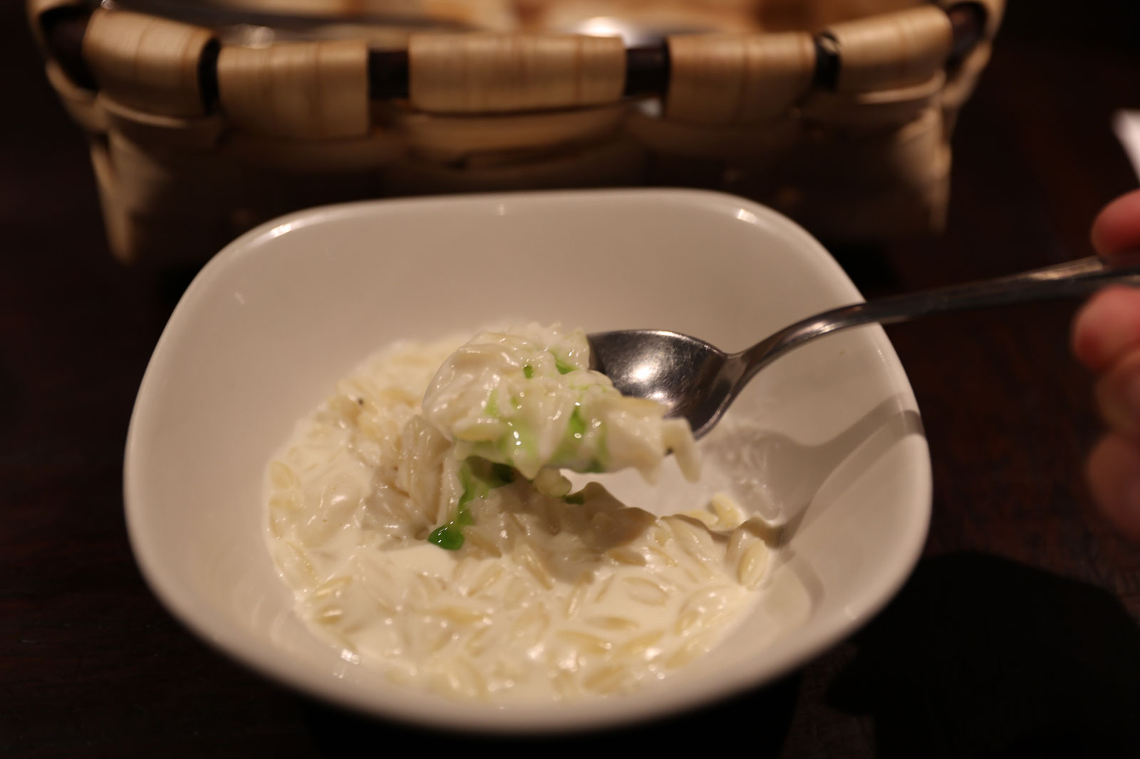 ここでは8割のお客さんが頼んでいると言っても過言ではないイディアサバル(羊乳)チーズのリゾット「リゾット・デ・プンタレッテ(4.40ユーロ)」をいただきます。リゾットといってもお米ではなく、米粒の形をした小さなプンタレッテというパスタを使っており、濃厚なチーズの香りと、もちもちした食感がクセになるひと皿です。