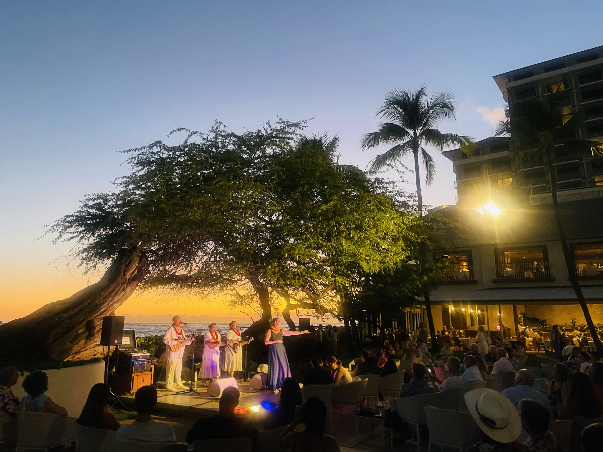 名門ホテル「ハレクラニ」内。17:30に予約して、フラショーとサンセットを眺めながら過ごすのが定番です。ハワイらしいカクテルとともに優雅な時間を。