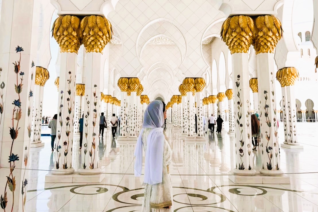 大理石の柱やモザイクタイルの美しい外観はもちろん、スワロフスキー製の巨大シャンデリアや世界最大の手織りのペルシャ絨毯など、豪華絢爛のモスクでの撮影に、民族衣装は最適です。厳しい服装チェックも民族衣装であれば問題なし。このモスクに行くために民族衣装を買う価値も十分ありますよ。女性はストールを忘れずに持参しましょう。