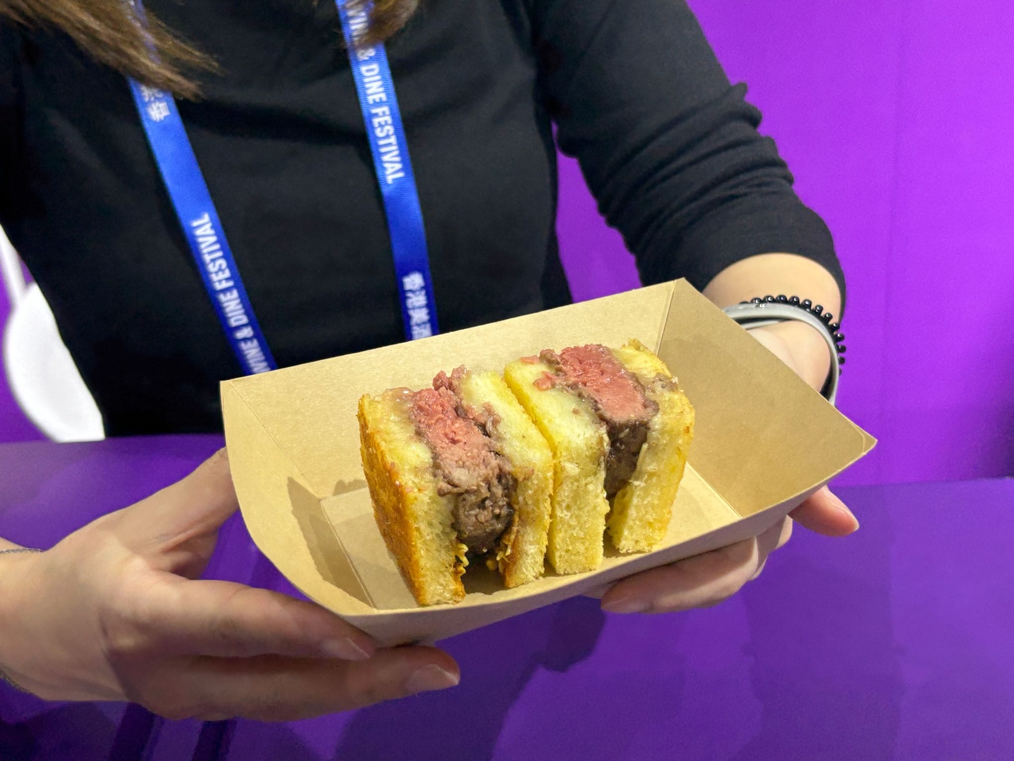 フレンチレストラン「Ami」のブースでは、“お酒に合う料理”として贅沢なビーフサンドイッチを提供していました。ジューシーな最高級牛肉に、とろけるフランス産チーズを合わせ、香ばしく焼き上げたトーストでサンド。塩気とうまみのバランスが絶妙です。さらに、オーストラリア産和牛のほほ肉を特製のブラックペッパーソースで味付けし、軽やかでサクサクの揚げパン生地に詰めた一品も登場。仕上げには、自家製の和牛ハムチップをトッピングして華やかに仕上げています。