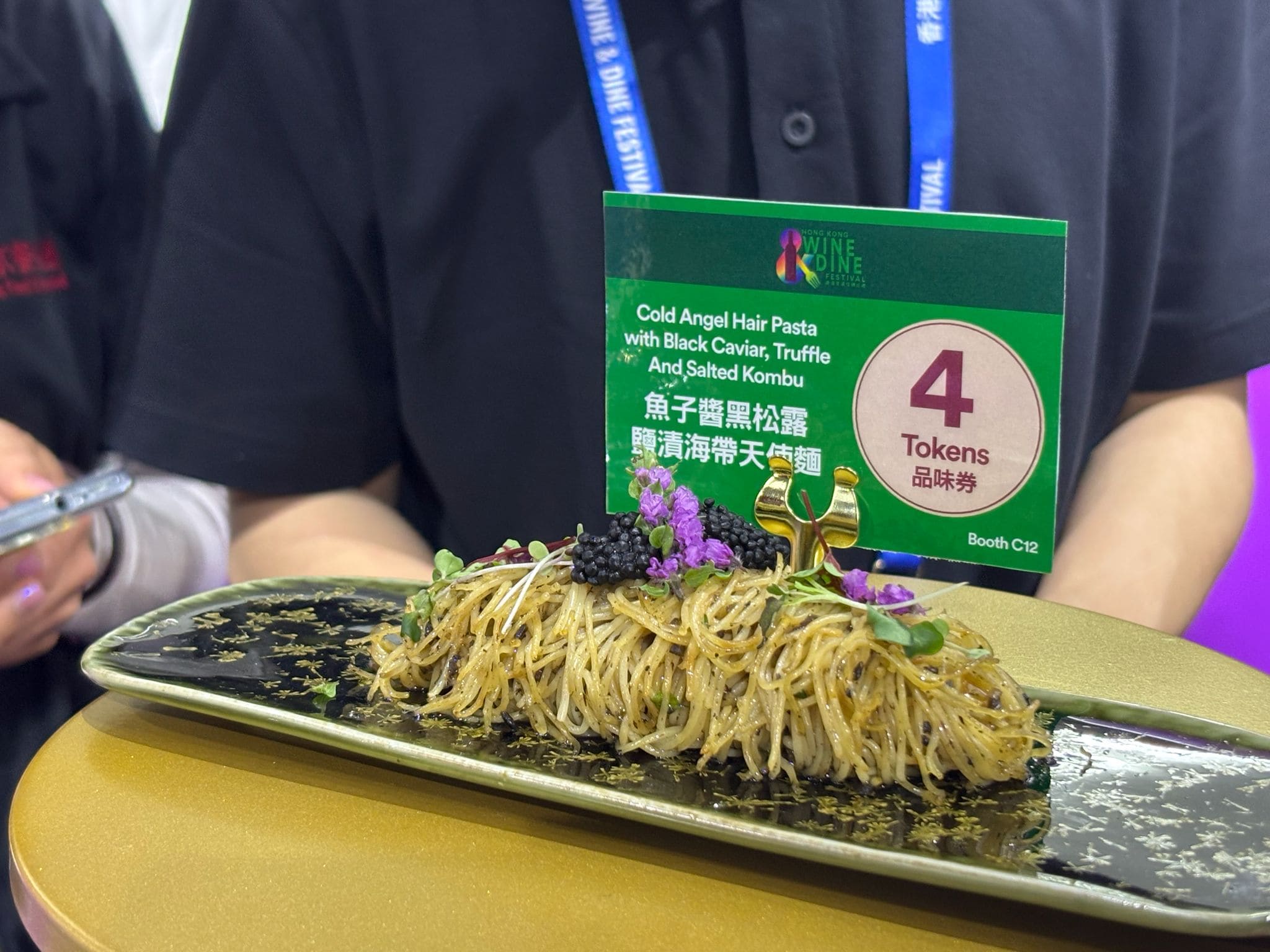 ジョエル・ロブションのブースでも、シグネチャーの「冷製エンジェルヘアパスタ キャビア・トリュフ・塩昆布添え」が提供され、訪れる人々を魅了していました。キャビアとトリュフで彩った冷製パスタは、清涼感と贅沢さが共存する代表的なメニューです。