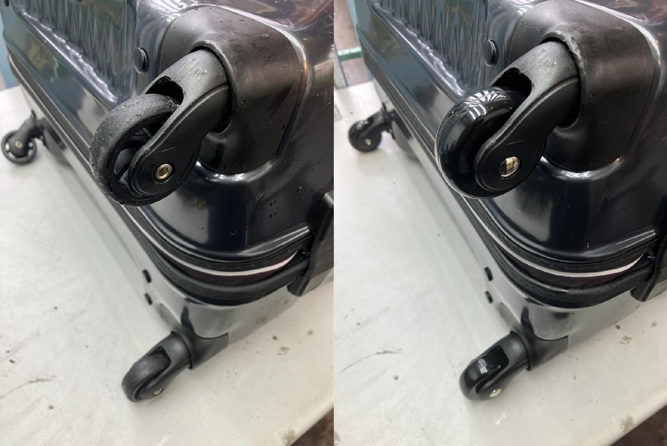 MY SUITCASEでは、キャスターの破損や故障の症状に合わせて修理、もしくはパーツの交換を行います。タイヤのゴムやスーツケースと繋ぐハウジングの部分など、故障の状態を見極めて対応します。ただし、一部のキャスターを修理した場合、見た目はキレイでも、実際に転がすと他のキャスターとの相性が合わないことも。場合によってはすべてのキャスターの交換を推奨する場合もあります。MY SUITCASEでは、引渡しのタイミングで違和感がないようにしっかりと調整してくれるので安心です。
