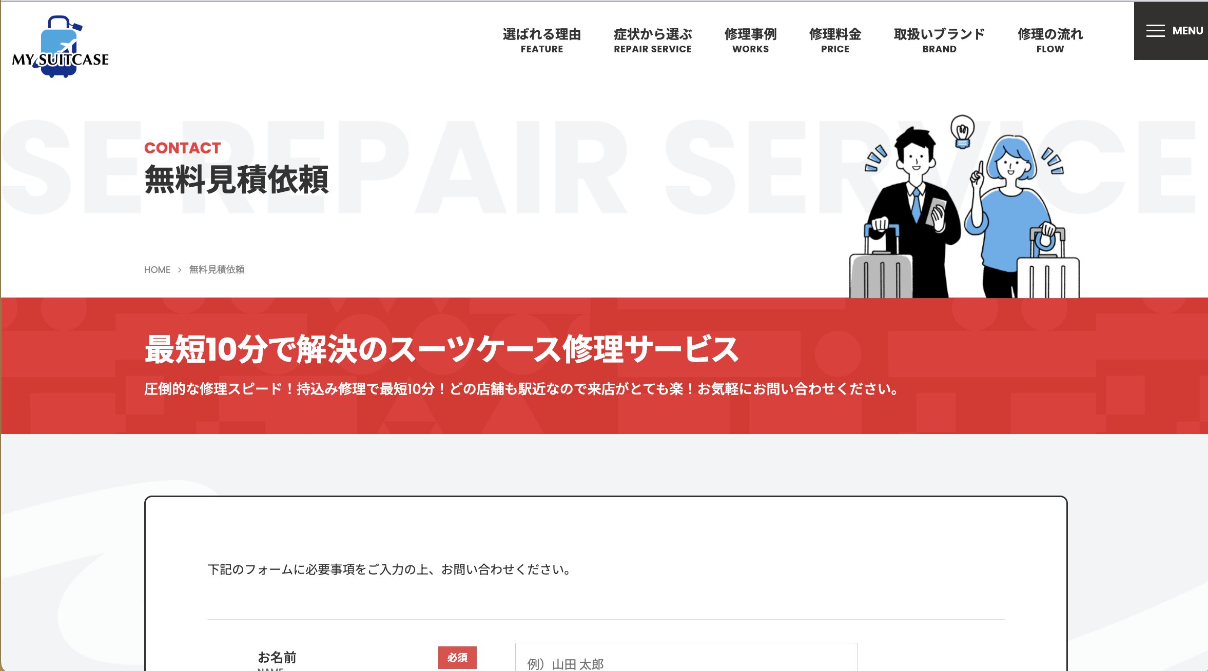MY SUITCASEの公式サイトには、オンラインで無料見積もりができる専用フォームが用意されています。お客様情報・ご希望の修理形態・メーカー・モデル・症状を入力し、該当箇所の画像を添付するだけで簡単にお見積もりできます。専用フォームのほかに、LINEによる1分見積もりや、電話での依頼も受付中。他社と比較して安さを実感するのもいいでしょう。