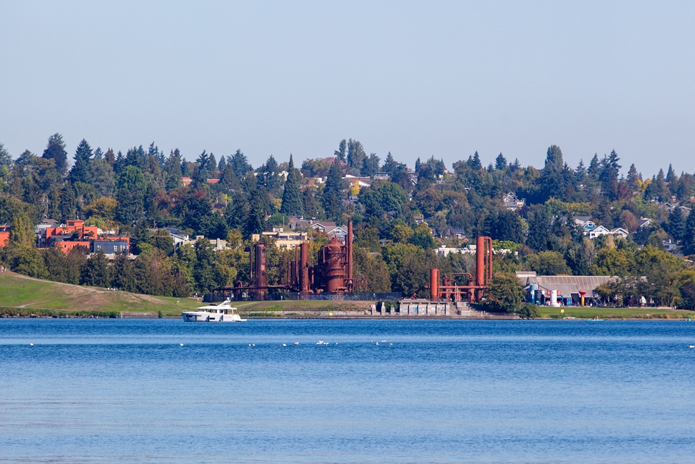 町のほぼ中心に位置する湖、レイク・ユニオンの北に広がるガスワークスパークは、かつて石炭ガス化工場地だった場所を再生したユニークな公園。青々とした芝生の一角に、植物が絡みつく巨大なガスタンクがオブジェのようにたたずみ、産業遺産とデザインが融合した象徴的なスポットとなっています。ここから湖越しに見るダウンタウンの景観は絶景。特に、夕暮れ時の美しさはひと際です。