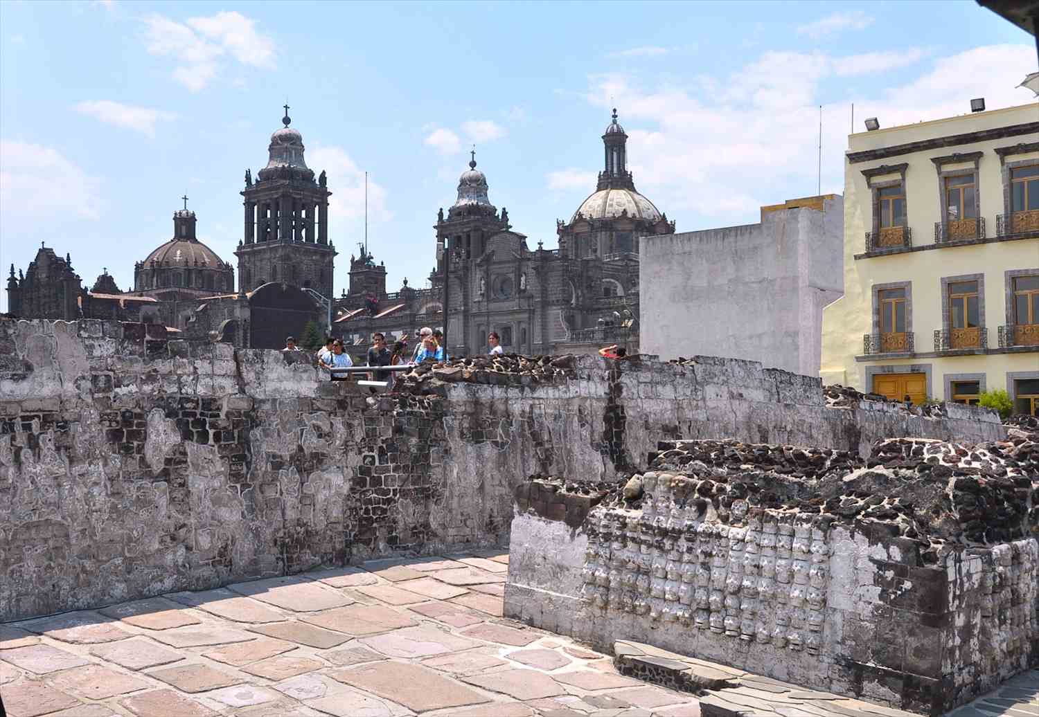 メキシコ・シティ歴史地区(Centro Histórico)の地下からアステカ帝国の神殿遺構が発見されたのは約50年前のこと。1978年の電力工事で巨大な円板が出土し、発掘プロジェクトにより現代へとよみがえったのがテンプロ・マヨール(大神殿)。雨の神や太陽の神を祀り、高さ45mを誇ったアステカの宗教中心地は、現在は基壇のみが残っています。