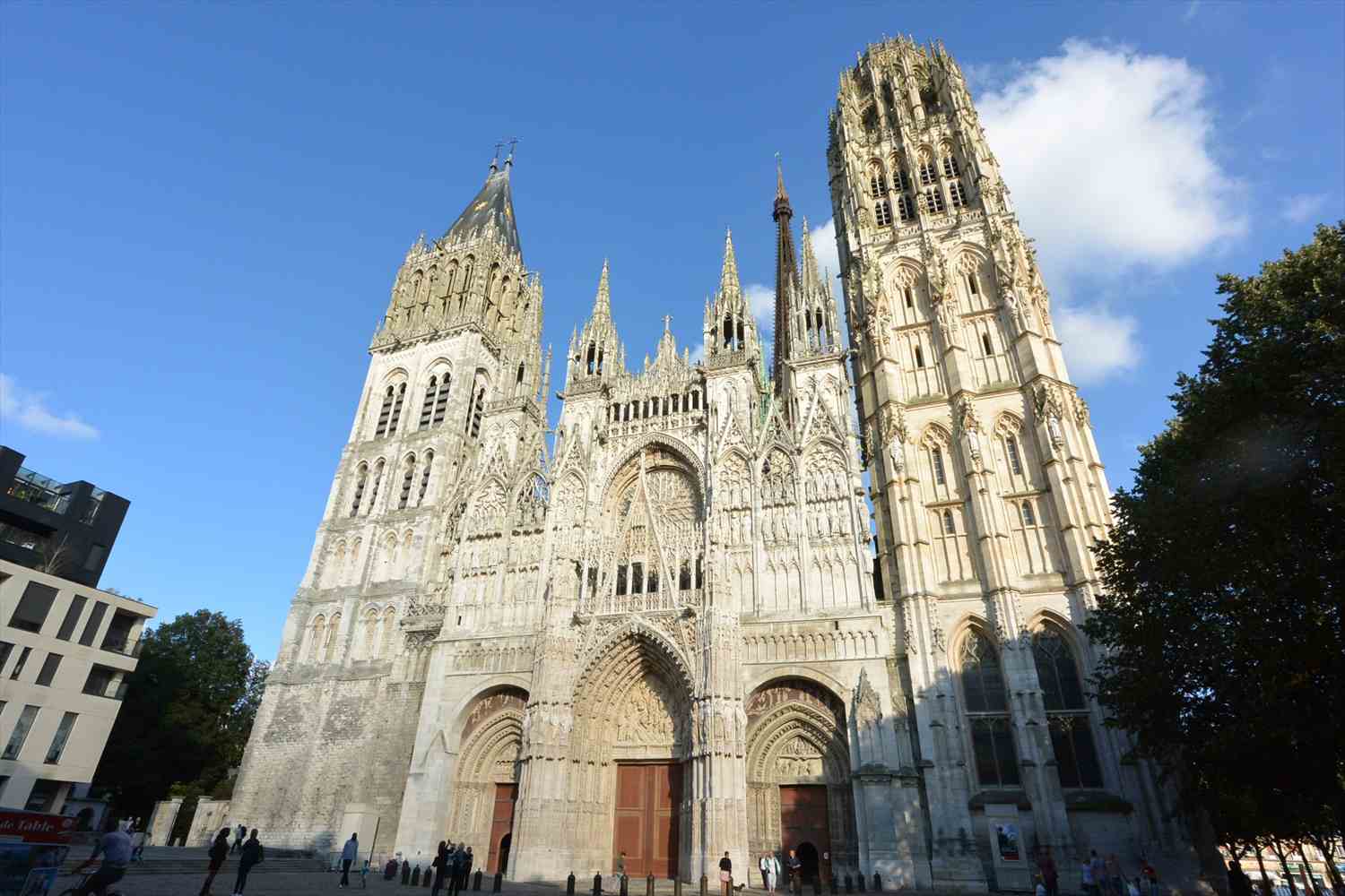 ジャンヌ・ダルク終焉の地として知られる古都ルーアンは、木骨組みの家が並ぶ美しい町。中心にそびえるノートルダム大聖堂は、モネの作品のモデルとなったゴシック様式の名建築です。モネは、大聖堂の向かいにある建物の2階から、ファサード(正面)を描きました。当時ここは下着店だったため、衝立てを立ててご婦人たちから見えないようにしていたのだとか。