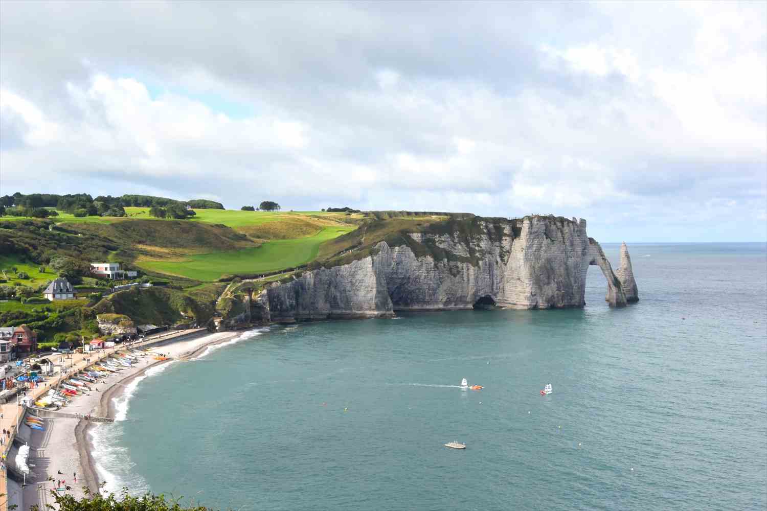 どちらの断崖も上を歩くことができるので、散策を楽しめます。アモンの崖の上には、現代アート作品が展示されたエトルタ庭園もあります。ふたつの断崖の間は全長1.5kmに及ぶビーチ。ただ、水が冷たいので、のんびり日光浴がおすすめです。