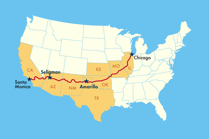 1926年11月11日、ルート66はU.S.ナンバー・ハイウエイ・システムが制定した連邦最初の国道のひとつとして誕生。東のイリノイ州から、ミズーリ州、カンザス州、オクラホマ州、テキサス州、ニューメキシコ州、アリゾナ州、カリフォルニア州の8つの州を横断していました。インターステートハイウエイの発達により1985年に廃線となりましたが、一部はヒストリックルート66(Historic U.S. Route 66)として残り、景観道路(National Scenic Byway)に指定されています。