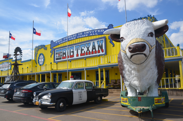 シカゴとロサンゼルスを結ぶ、ルート66の真ん中あたりに位置するテキサス州アマリロ。この町には地元の人だけでなく、世界各国の旅行者が訪れるステーキレストランがあります。1960年創業の老舗レストラン「ビッグ・テキサン・ステーキ・ランチ」は、72オンス(約2.2kg)のステーキを1時間以内に完食すれば無料になることで有名。木目調であたたかみのあるカントリースタイルのインテリアのなか、カウボーイハットをかぶったスタッフがサーブしてくれます。名物料理のプライムリブ・ステーキ(29.72ドル〜)やサーロイン・ステーキ(25.72ドル〜)、リブアイ・ステーキ(33.72ドル〜)のほか、サンドイッチやパンケーキ、チキン&ワッフルなどもあります。