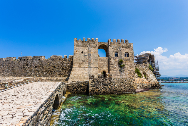 メトーニ城は、ペロポネソス半島の南西に海へ突き出すように建つ中世の要塞。現在は廃虚となっている城は、13世紀前半、この地域を支配下に置いたヴェネツィア共和国によって築かれたとされています。15世紀後半以降、オスマン帝国がたびたび侵攻を試み、1500年にはついに陥落。その後オスマン帝国は城壁を増強したものの、ヴェネツィアとの戦いは長期化し、町は徐々に疲弊。18世紀には衰退が進み、現在は城壁やアーチ、そして海に突き出た塔が往時の姿を静かに伝えています。