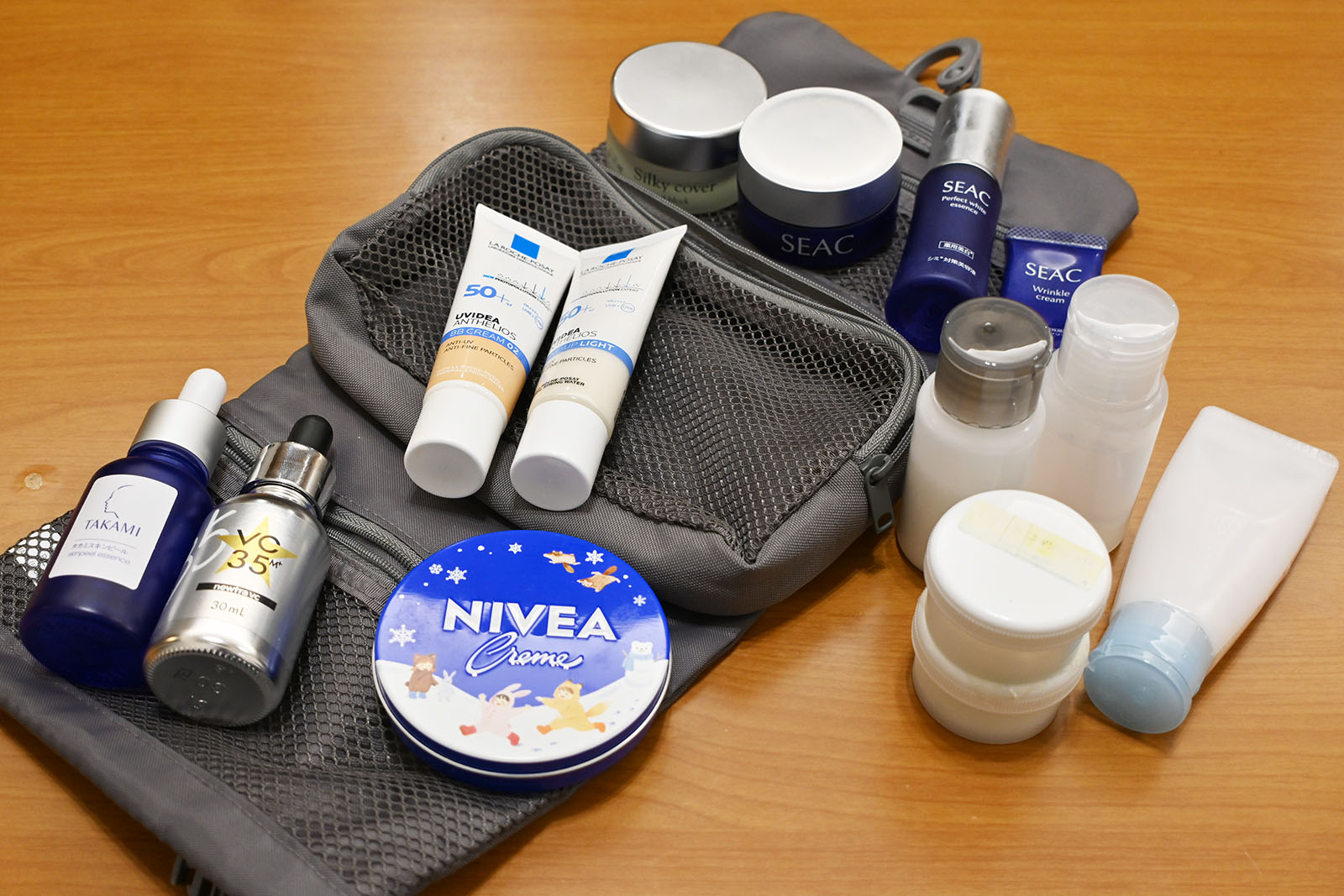 着ているもののほかに、もうひと組の下着があれば、毎日洗濯しながらでも着替えができます。必要とする洗面具や化粧品は人によって異なりますが、旅先で使い勝手のいいものを探すのは難しいことと思います。これさえあれば、というものを揃えて、機内持ち込みにしましょう。