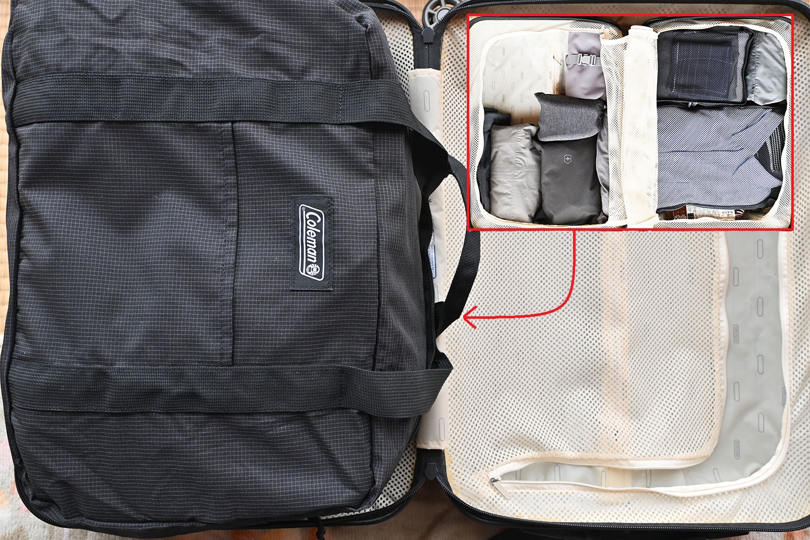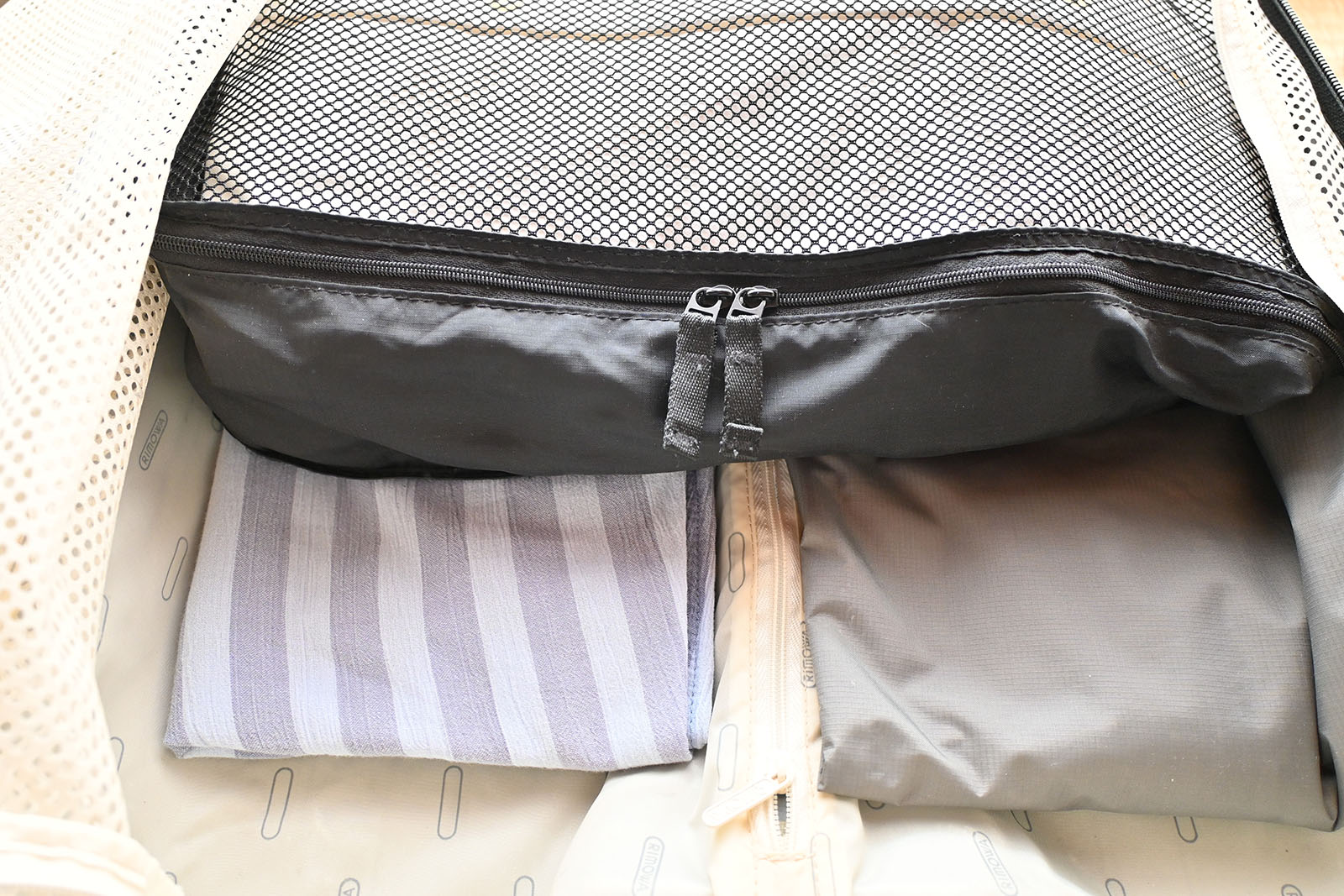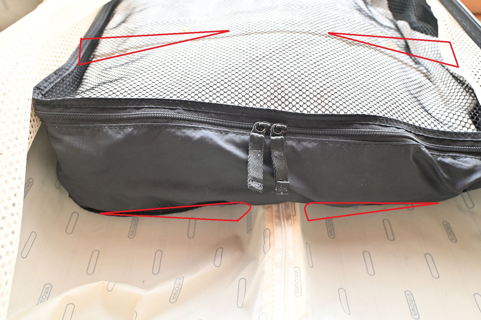 わずかな隙間でも、その空きはデッドスペースになります。軽量のスーツケースの場合、ハンドルを収納する部分が盛り上がっていて、スーツケース内部に段差が生じています。この段差を埋めてから小分け袋を配置しましょう。
