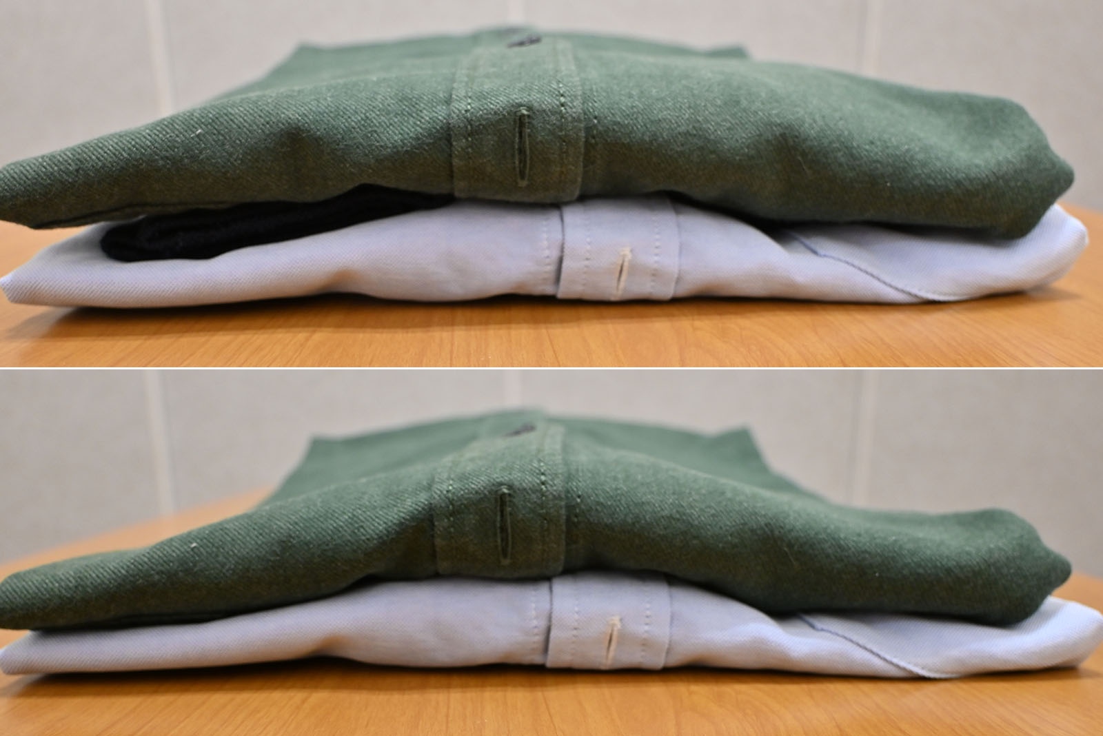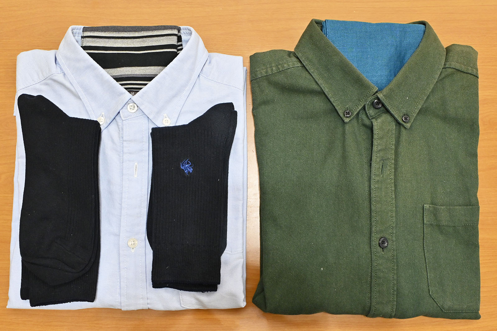 いよいよ小分け袋に入れます。シャツ類は襟元にハンカチなどを挟むと、形が崩れにくくなります。下着類は筒状に丸めて収納すると隙間を埋めることができます。男物のシャツを畳むと、ボタンホールのある前立てと呼ばれる部分が厚くなります。何枚も重ねるとサイドの前身頃の部分がくぼんでしまいますので、ここに靴下を配置するなどして、厚みを調整しましょう。