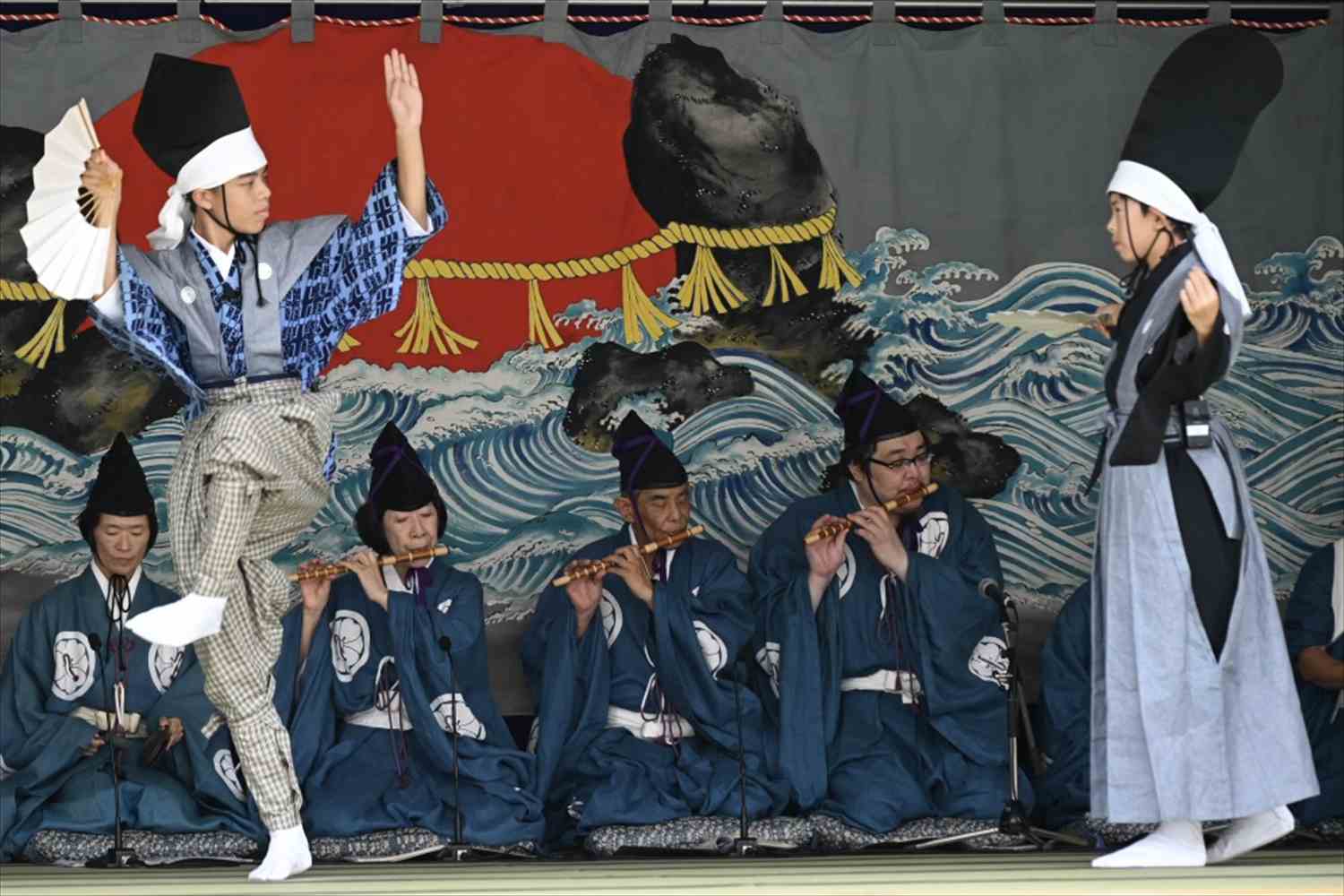 綾子舞は、女性が踊る「小歌踊」と、男性が演じる「囃子舞」、「狂言」によって構成され、この3つをまとめて「綾子舞」と称されます(囃子舞と狂言は、江戸中期に京都の狂言師が伝えたとされています)。綾子舞の華といえるのが、小歌踊。女性たちの扇子の手振りと足捌きが見どころの優雅な舞です。現代の歌舞伎とは趣が異なるものの、振袖やだらり帯といった衣装、ユライと呼ばれる赤い布の被り物は、出雲の阿国による女歌舞伎の面影が残っているといわれています。