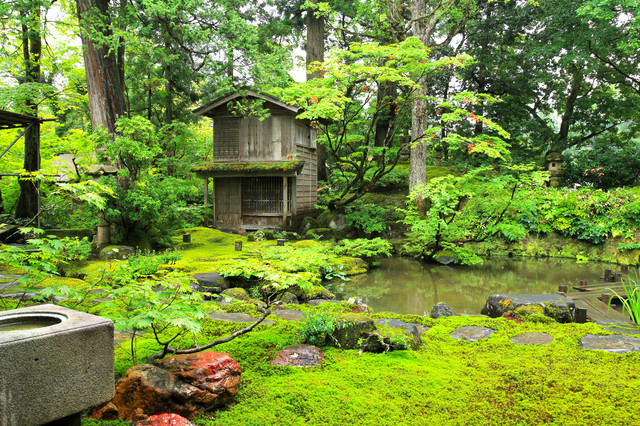 江戸時代の大庄屋・村山家の庭園。雪国に京都の風情を持ち込むべく作庭されたもので、小堀遠州の手法を取り入れ、池の周りに茶室を配した桂離宮にも似た回遊式庭園となっています。11.5ヘクタールの敷地は「真」、「行」、「草」の3区に分けられています。