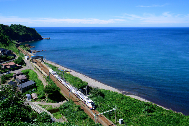 JR信越本線の無人駅。駅のすぐ下が海岸線となっており、海から一番近い駅ともいわれています。プラットフォームからは遮るものなく日本海が広がっており、特に夕日は絶景。『高校教師』(出演:真田広之、桜井幸子:1993年)や『ストロベリー・オンザ・ショートケーキ』(出演:滝沢秀明、深田恭子:2001年)など、ドラマのロケ地としても知られています。