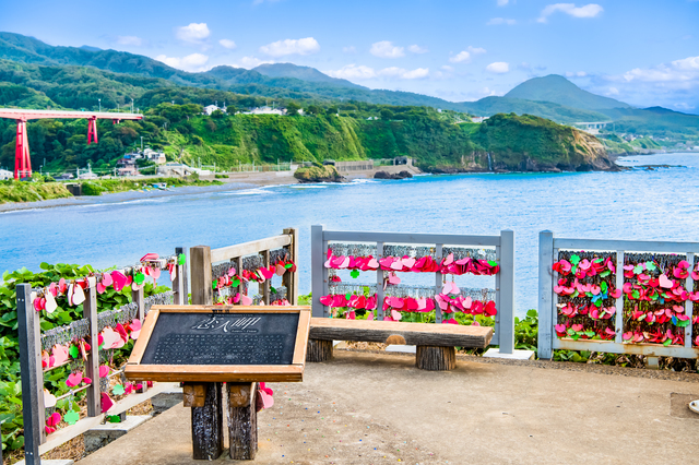 そのひとつが「鴎が鼻」。鴎福浦海岸を一望でき、霊峰・米山や晴れた日には遠くに佐渡島も望めます。ここからの日本海に沈む夕日の美しさは抜群。別名「恋人岬」とも呼ばれ、恋愛成就のパワースポットとして知られています。設置された柵にふたりで鍵をかけると将来幸せに結ばれるそう。